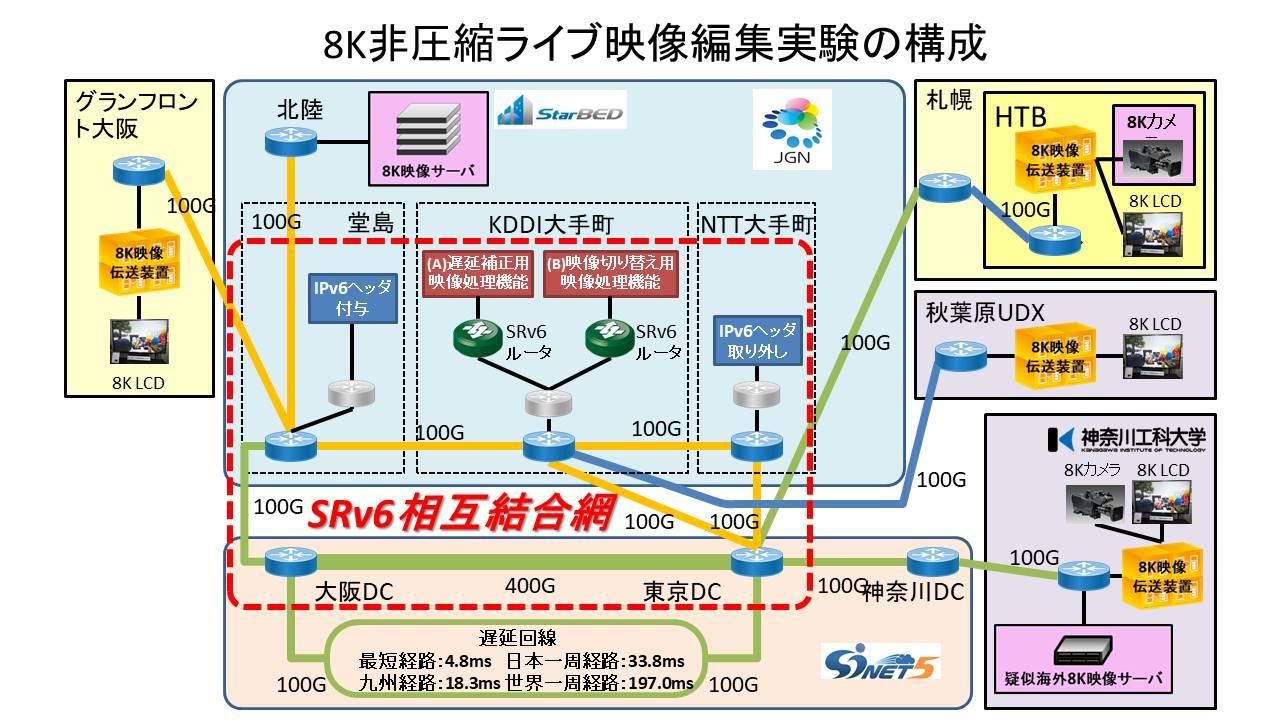 本実証実験は、「国立研究開発法人 情報通信研究機構」、「大学共同利用機関法人・情報・システム研究機構 国立情報学研究所」をはじめとする複数の関係組織との共同で、札幌-東京-大阪間の100Gbps広帯域国内回線を用いて、8K(7680×4320画素・ハイビジョンの16倍)非圧縮映像の8Kデュアルグリーン(8K-DG)フォーマット(24Gbps)を対象に行った。新規開発したSRv6相互結合網は、NTT堂島(大阪)、KDDI大手町、NTT大手町の3箇所で分散構成し、SRv6ルータには、古河電気工業株式会社のFX201とミハル通信株式会社と神奈川工科大学が共同で開発したソフトウェアベースのパケットスイッチを用いている。