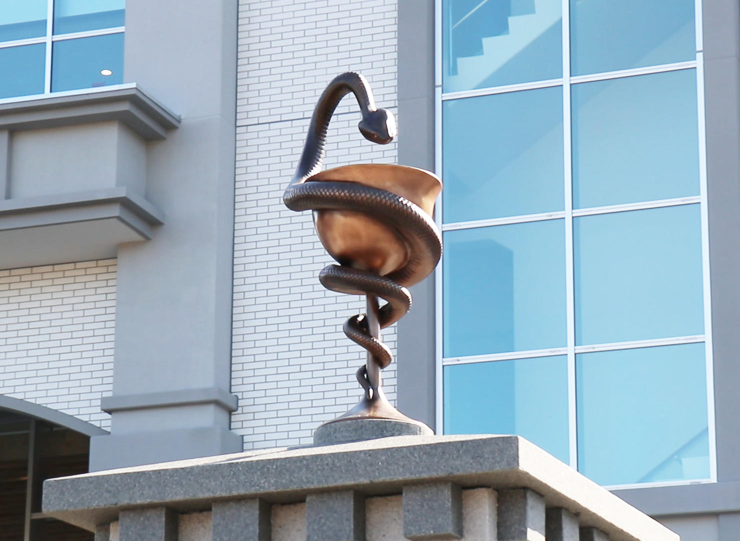 門柱には、芸術学部美術学科の勝野眞言教授(改組 新 第6回日展「文部科学大臣賞」受賞)が薬学のシンボルとして製作した「ヒュギエイアの杯」のモニュメントを設置。また、講義棟前には新たに循環バス停が置かれ、時刻表も更新されている。