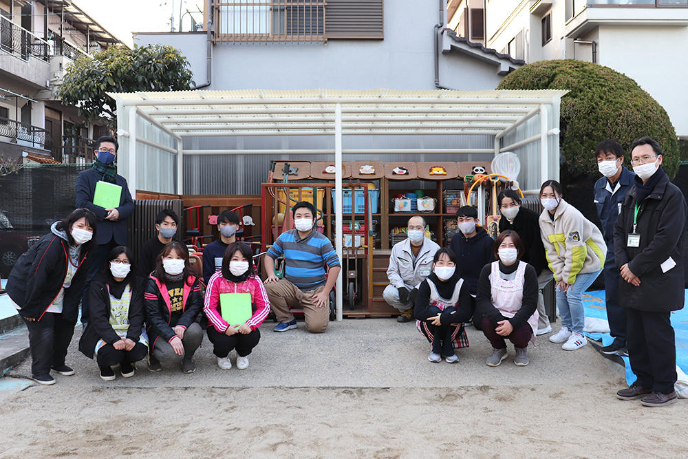 本学工学部建築学科2年生の学生らが本学に隣接する「寝屋川市立中央幼稚園」に「インテリア計画」(北澤 誠男准教授)の授業で設計・制作した遊具収納棚を贈呈しました。