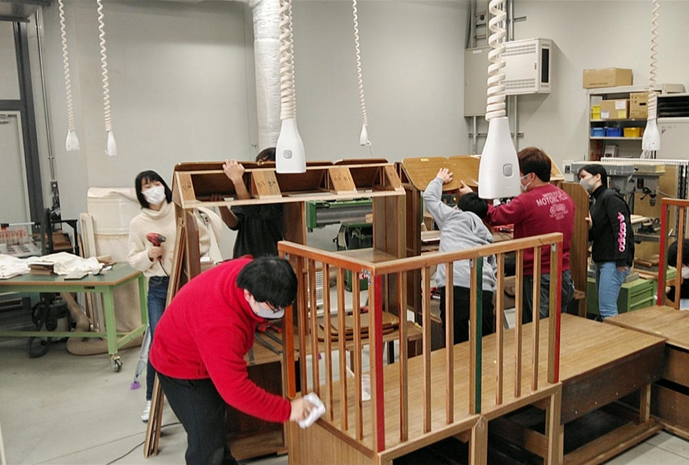 本学で42年間の長い間、学生の学びを支えてきた講義机と椅子が、建築学科の学生たちの手で新しく生まれ変わり、これから子どもたちの成長を見守ります。