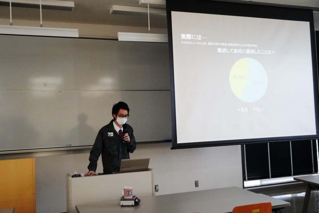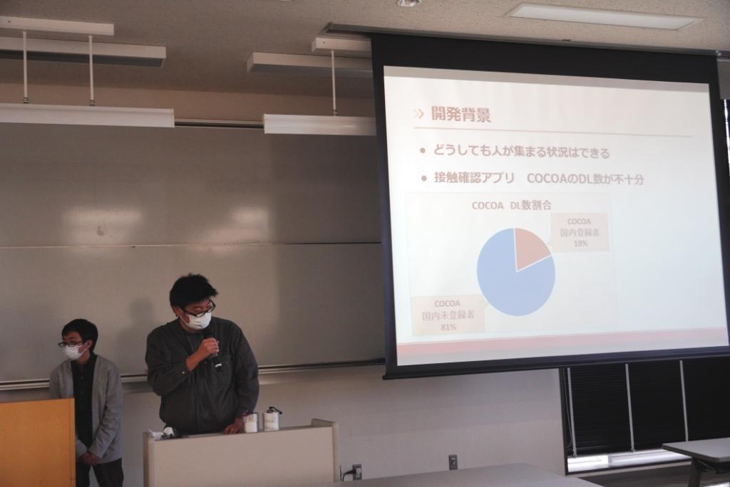 コロナ禍であり、2会場で午前中に開催された予選会は、各会場に2~3チームずつ入場するなどマスク・消毒・換気のほか感染防止対策に十分配慮しました。各チームは発表7分の持ち時間をフルに使って作成したプレゼン用資料を説明。必要によっては現物を使ってのパフォーマンスを見せるチームもありました。20チームが参加し、予選を通過した8チームが、午後の本選出場の権利を獲得しました。本選では、外部審査委員をお招きし、質疑応答を交えながら厳正な審査を行い、結果、以下のチームが受賞しました。指導した総合機械学科の平井聖児教授は、「課題解決のためのアイデアを重視する教育を本学では強化しています。外部審査委員の評価は、学生たちに実用化への厳しさを理解してもらうなど、大きな刺激になったと思っています」と話していました。開発品やパネルは、2月8日(月)から製造棟1階廊下に展示される予定です。