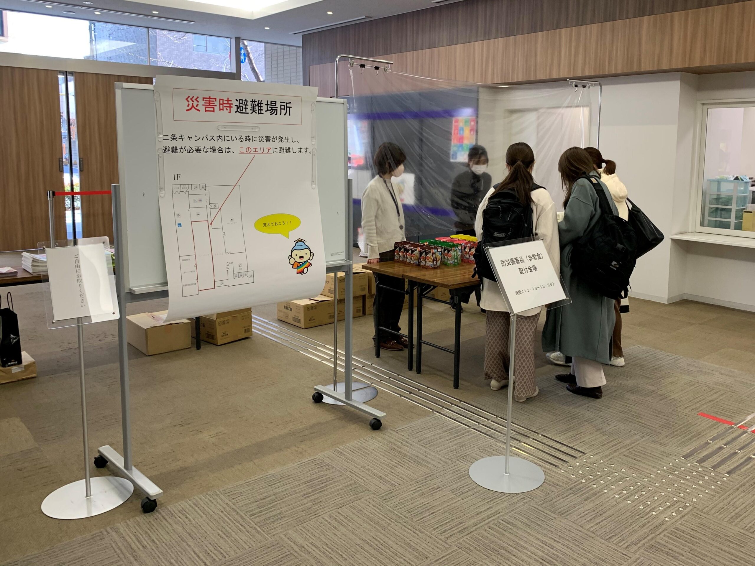 紫野、二条両キャンパスにおいては、館内放送によるシェイクアウト訓練に引き続き、避難訓練および災害時避難場所での災害備蓄品配布訓練を実施いたしました。