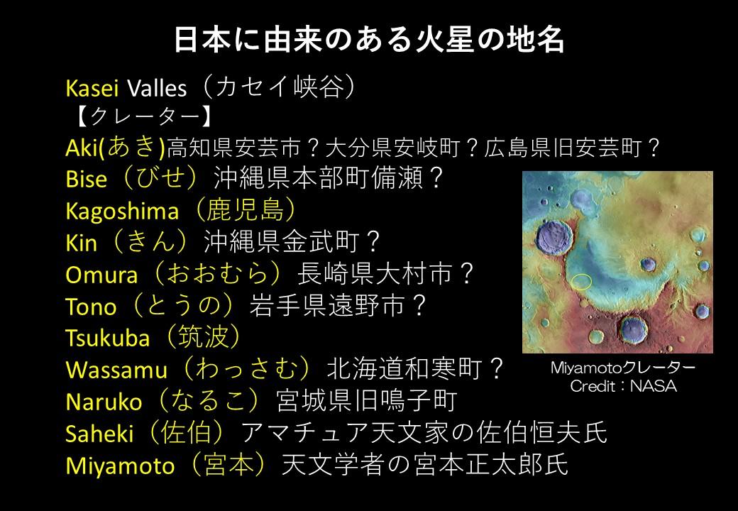 火星は、地球に住む私たちにとって身近な惑星であり、有人飛行や移住を目指す惑星としてJAXA宇宙飛行士のミッションロゴにも描かれていることを紹介した。また、火星にも山やクレーターなどに名前があり、中には日本の地域や人物由来の地名があることを紹介した。
