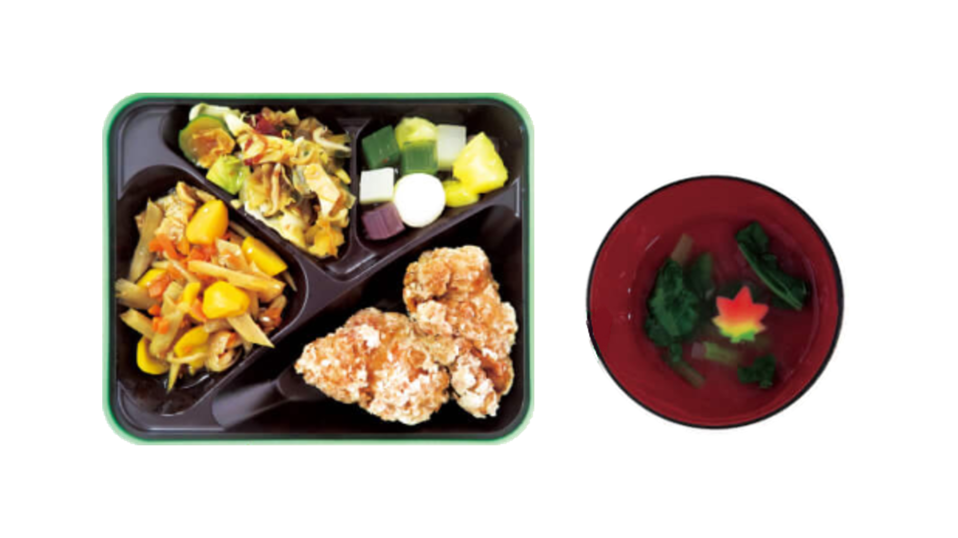 「もみじる」(もみじ麩のすまし汁)は、百人一首32番「山川に風のかけたるしがらみは流れもあへぬ紅葉なりけり」(春道列樹)をモチーフとし、歌中の紅葉を「もみじ麩」に見立て、川に流れる葉を野菜で表現。「もみじる」というメニュー名は、「もみじ+汁」を縮め、呼びやすい名称に工夫している。「鶏肉の竜田揚げ」は、百人一首17番「ちはやぶる神代も聞かず竜田川からくれなゐに水くくるとは」(在原業平朝臣)の「竜田川」に由来している。