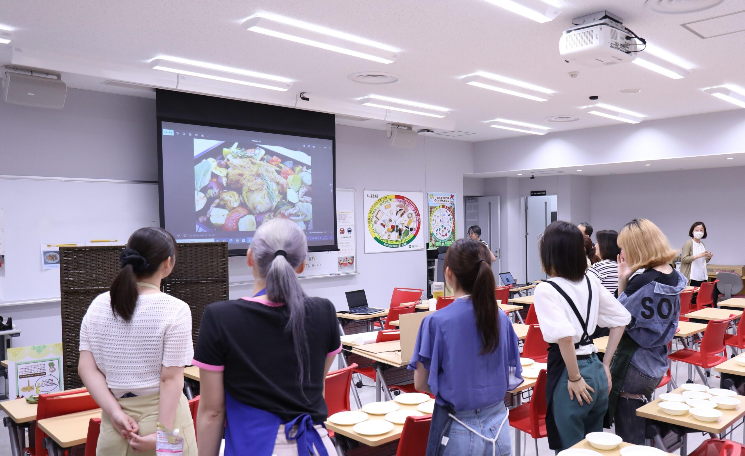実践女子大学の学生は6月に京王ストアの店舗を視察、その後、レシピカード、デジタルサイネージ・帯カード、リーフレット担当の3グループに分かれ、レシピ開発や動画の作成などに取り組んできました。減塩レシピを考えたグループの一人、小木曽天音さん(2年生)は「できるだけ季節の野菜を使うよう工夫をした。カッテージチーズ作りでは、塩の代わりにレモン汁を使うという、授業で学んだ知識を生かすことができた。自分自身が減塩料理に取り組んだのは初めてで難しかったが、おいしい料理に仕上げることができた」と喜んでいます。食生活科学科の辛島順子准教授は「若い学生の新しい発想を入れて、減塩に興味がない人たちにも伝わるような内容にしていければという思いで取り組んだ。学生にとっては視野を広げたり、経験を積んだりする機会になったと思う。レシピカードにQRコードを載せて保健所のホームページも閲覧可能にしたため、保健所のさまざまな発信を知っていただけるきかっけにもなり、とてもよいと思う。大学が地域に貢献できたらという思いがあり、産学官連携の取り組みの意義は大きい」と話しています。