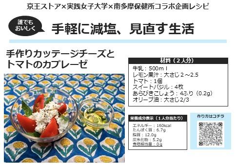また、3種類のレシピカードには、共通して「手軽に減塩、見直す生活」という学生が考えたキャッチコピーが印刷され、見た目にも鮮やか。完成品の写真も学生が撮影しました。レシピカードには、南多摩保健所のホームページのQRコードを掲載し、3者のコラボ企画や詳しい作り方が紹介されています。京王ストアの各店舗のLINEでも16日からのスタートに合わせコラボやレシピについて紹介される予定です。