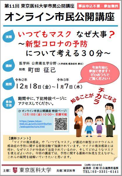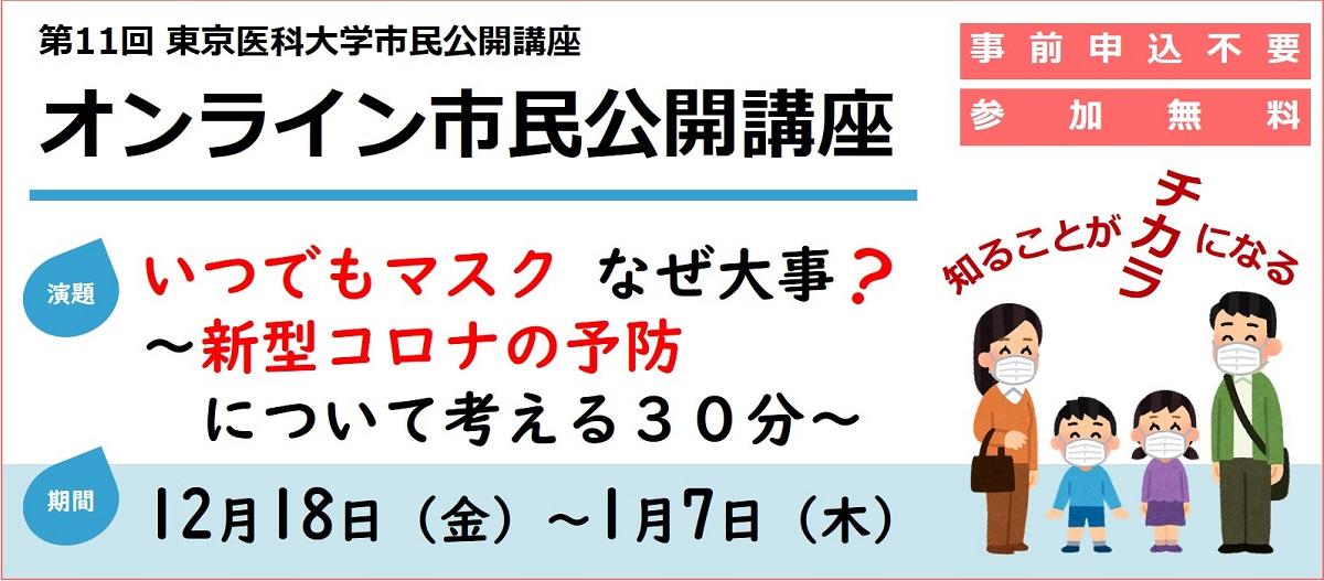 東京医科大学が、新型コロナ予防に関して「いつでもマスク なぜ大事?」と題した市民公開講座をオンラインで開催(1月7日まで)