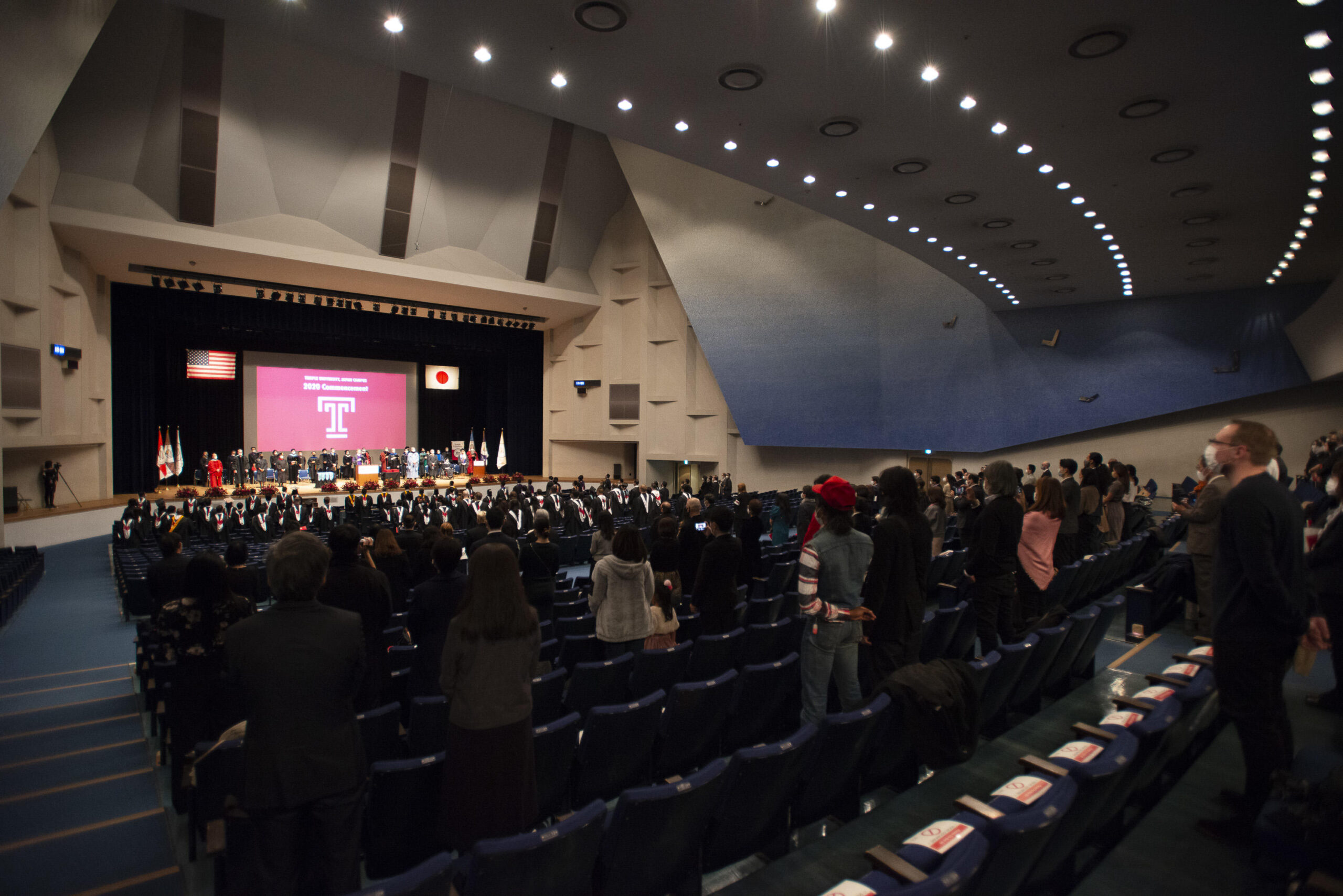 テンプル大学ジャパンキャンパス(東京都世田谷区/ 学長 マシュー・ウィルソン/以下、TUJ)は12月11日(金)、昭和女子大学人見記念講堂にて卒業式を挙行しました。本来6月に行っていた卒業式を12月に延期。コロナ禍の開催となったため、感染症対策を十分に行った上で執り行われました。また例年とは異なり、テンプル大学米国本校からの来賓は迎えずにビデオメッセージでの出席となり、学生、来賓、教職員全員がマスク着用、対人距離を保ちながらの挙式となりました。