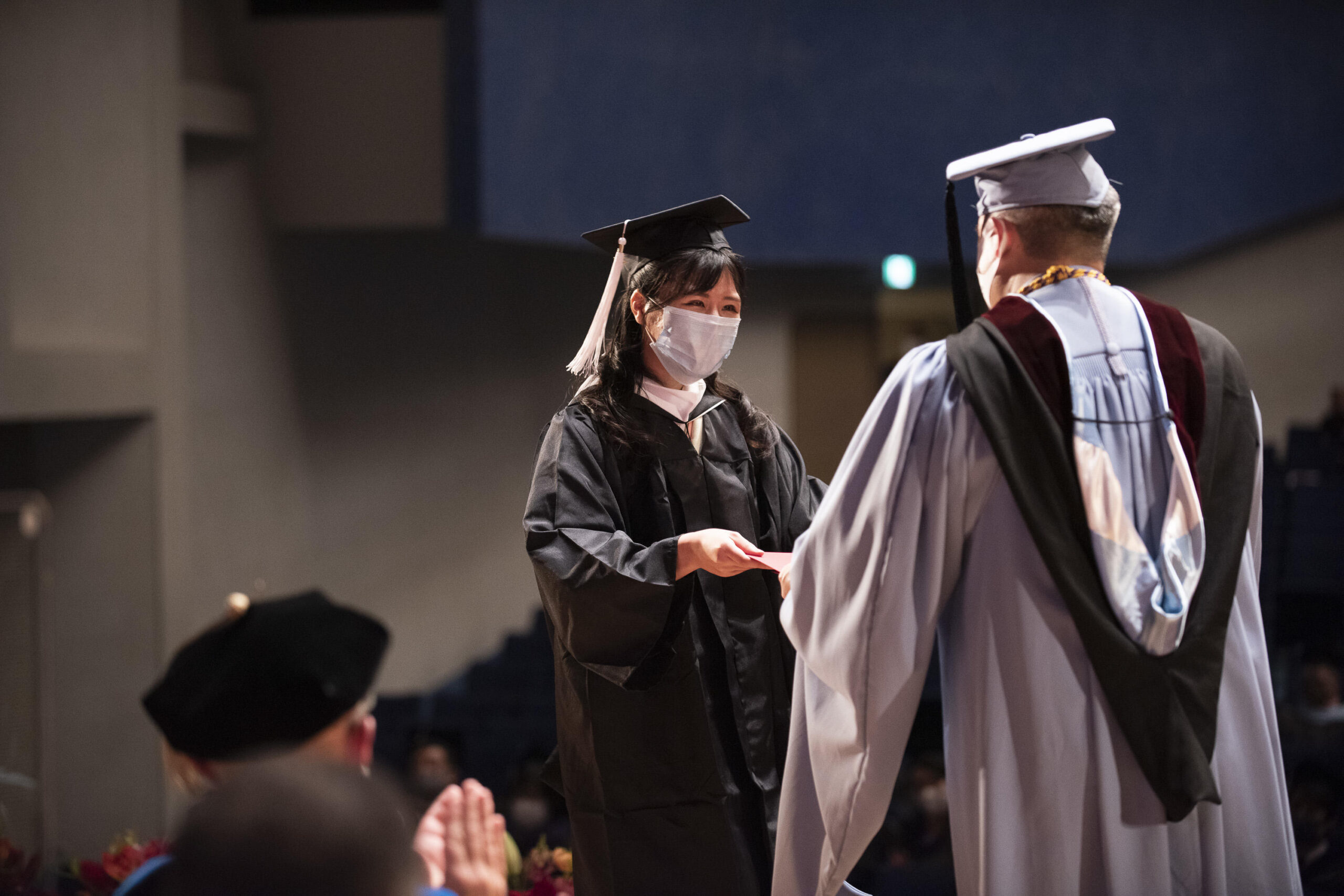 2020年度の卒業生内訳は、大学学部(学士、準学士)が307名、大学院(修士、博士)が131名、合計438名。例年とは違った卒業式になったものの、大学生活での苦難を乗り越え当日を迎えた卒業生たちは、未来を大きく見据え、希望に満ちた喜びの姿を、家族、友人、教職員に見せました。