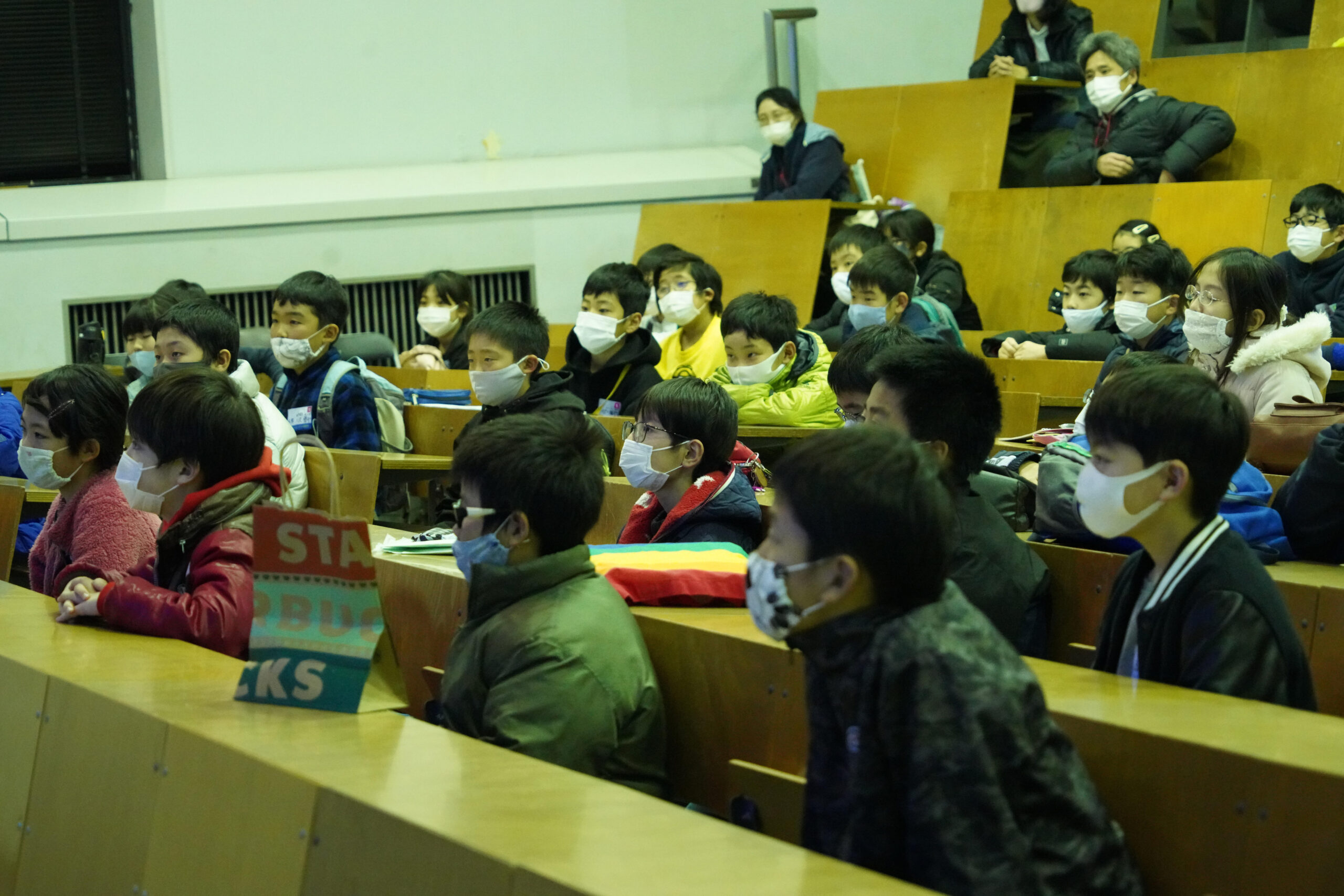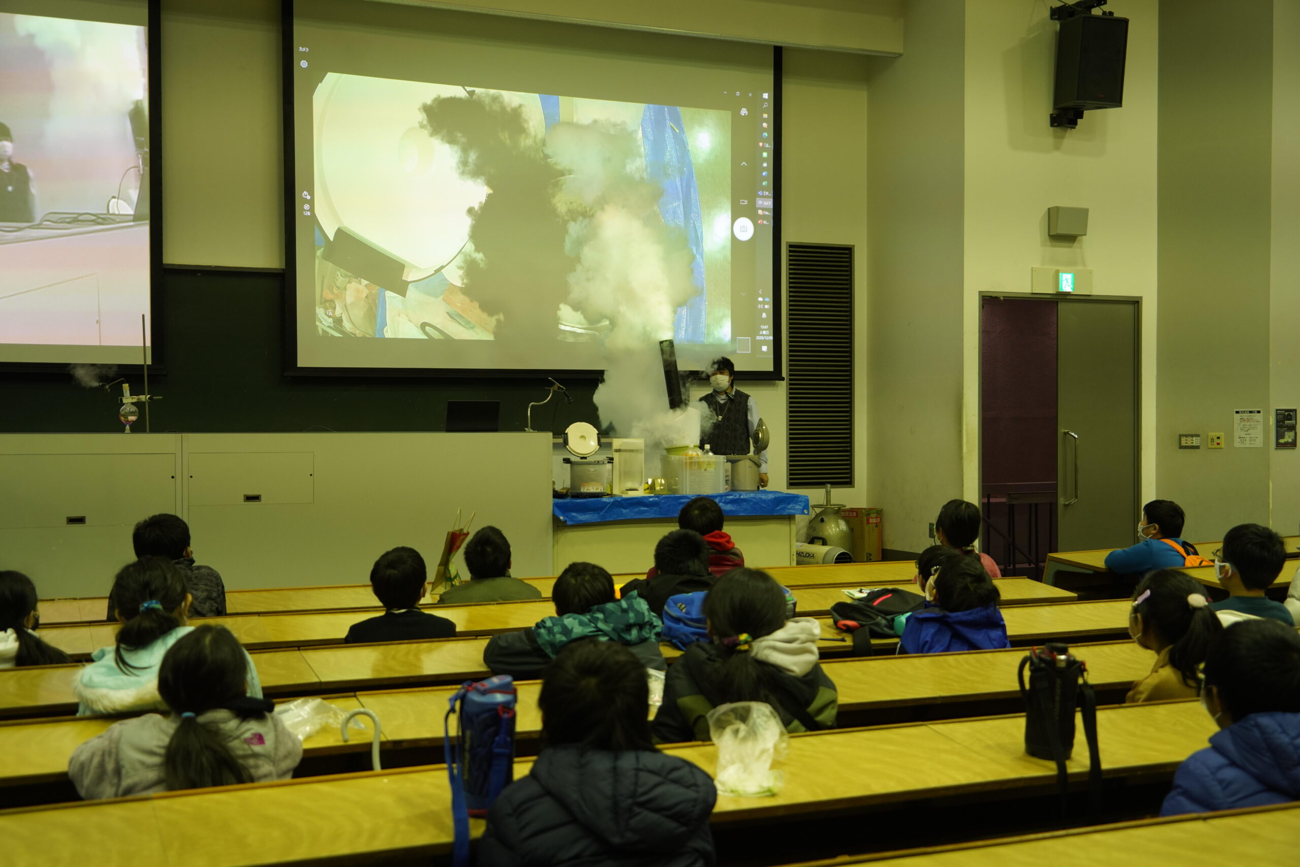 日本工業大学では「科学者になりたい」をテーマに教室を開催。当日は48名の小学生とその保護者に向けて、共通教育学群の佐藤杉弥教授、服部邦彦教授、梅谷篤史准教授、狩野みか准教授、鳥塚潔講師、佐藤由佳講師が講師となって前半は工作、後半は実験を行いました。工作では、(1)トコトコ歩くおもちゃ (2)LEDカラーライト (3)ミニホバークラフト (4)骨伝導スピーカーから1つを選んで12名ずつ4つの教室に分かれて製作しました。工作キットはすべて本学教員の手作りのものです。講師の解説を聞き、保護者にも手伝ってもらいながら作品を完成させた参加者は、実際に動かしてみたり遊んだりしながら楽しく学んでいました。後半のサイエンスショー「”超”を体験しよう!~超低温、超高温、超高圧の実験~」では、安全な距離がとれる大教室に全員が集まって、液体窒素でいろいろなものを凍らせたり蒸気噴火を起こしたりする実験や、電子レンジを用いたミニオーロラや火の玉などの超高温電離気体(プラズマ)の生成実験を、直接目にして体験しました。サイエンスショーが終わると、参加した小学生だけでなく保護者も「びっくりした」「面白かった」と言いながら帰っていきました。