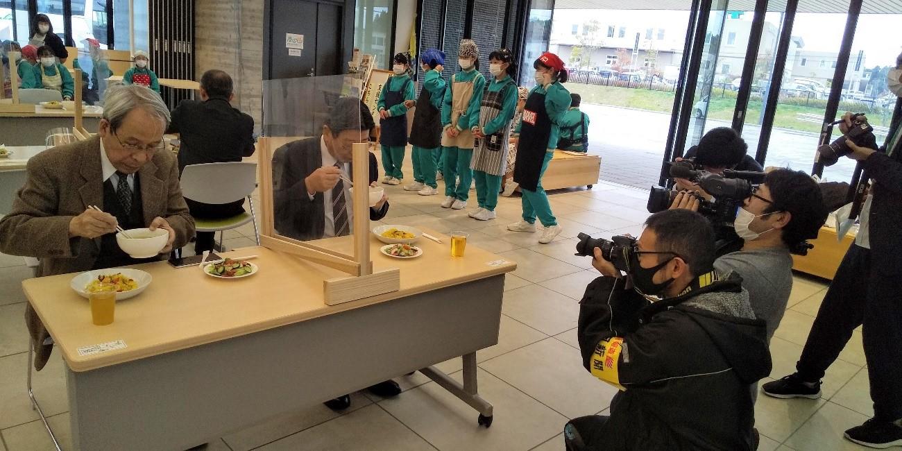 11月20日(金)、南三陸町役場マチドマで開かれた両校による「一日レストラン」が開かれ、大学生たちの指導のもと生徒たちが調理したメニューが振舞われ、川久保清学長、佐藤仁町長らが試食した。