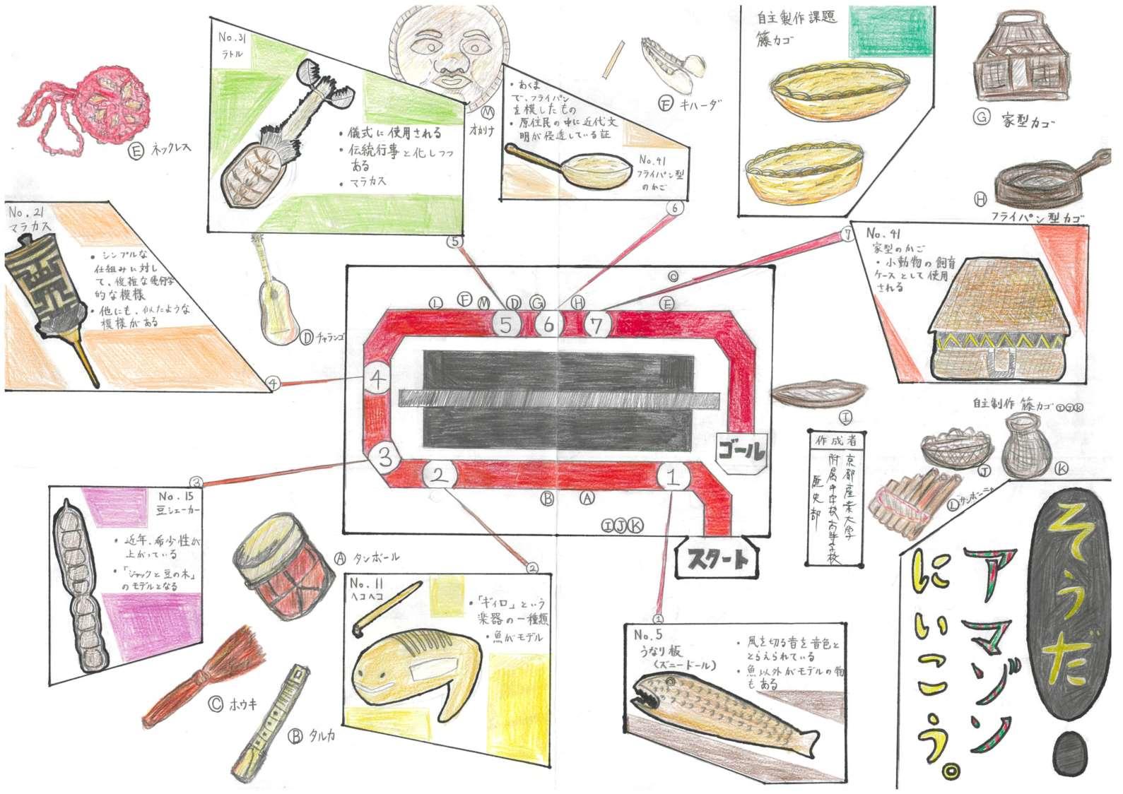 また、本企画展に合わせて、京都産業大学附属中学校・高等学校 歴史部の生徒が、展示資料を紹介する案内マップを制作した。歴史部の生徒は、中学生と高校生の視点で関心をもった民族資料をマップで取り上げ、手書きイラストを交えることによって、あらゆる年代の方に分かりやすく、見やすいマップを心掛けた。展示案内マップは3種類制作し、ギャラリー企画展会場にて無料で配布している。