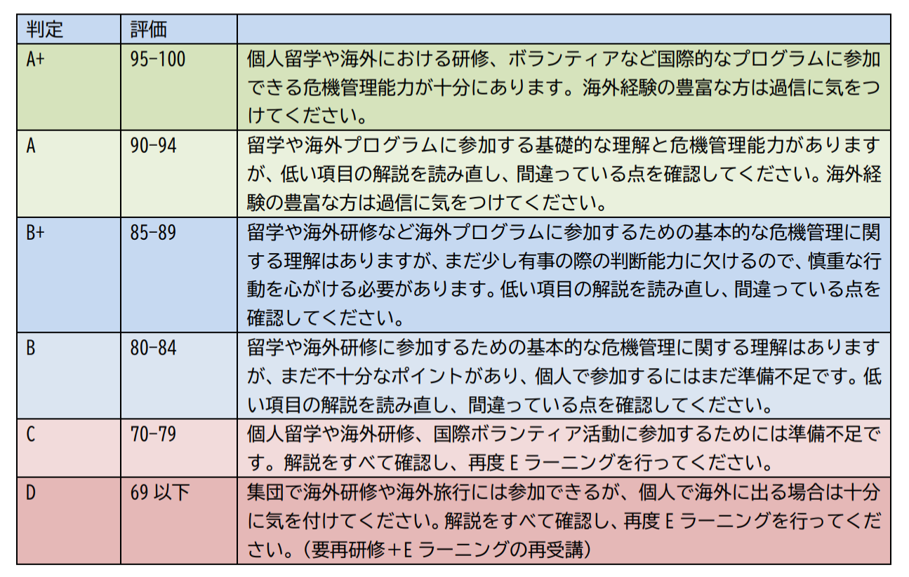 このEラーニング・プログラムは、学生自身のリスク管理の理解度をA-Dランクで数値化して「見える化」することにより、各自が自分のリスクに対する理解度のレベルを把握することができます。また、大学全体、学部、留学プログラムごとに、各学生の海外での学びに伴うリスクの理解度を分析することが可能で、その分析結果に基づいた助言を学生に提供することが出来ます。