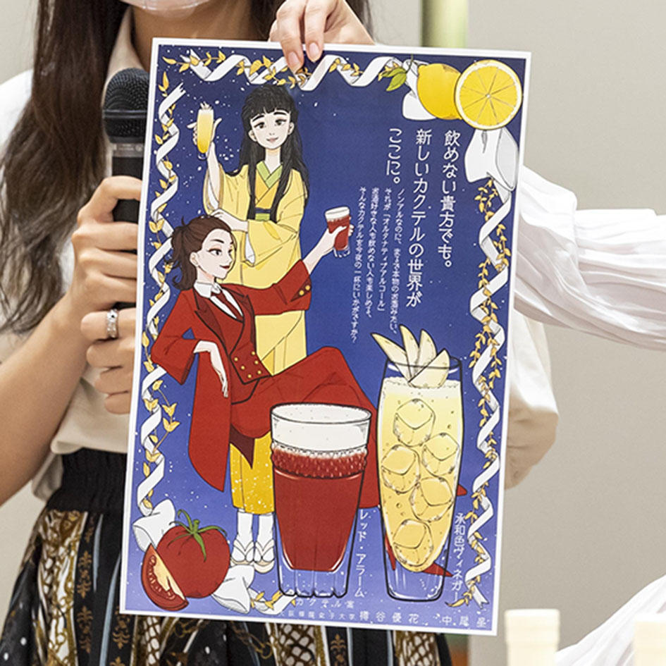 ライフプランニング学科フードスタディコースでは、食生活と食ビジネスに関する専門的な知識やスキルを身につけ、「食」を通して社会で活躍できる人材を育成しています。本学科の授業のひとつ「フードメディア研究」では、現代メディアのあり方を理解し、食関連企業とコラボレーションを行いながら食の流行や企画作りを学び、女子大生の目線から新商品の開発を行っています。今回は、約半年かけてお酒の飲めない人や飲める人も楽しめる「オルタナティブアルコール」のレシピの開発、ネーミングやポスターづくりまでを取り組みました。日頃、料理を通じて様々な食文化を学ぶ本学の学びを生かし、食材が生み出すアクセントや食感にも配慮しました。また女性ならではの視点で「かわいい」と「映え」にもこだわったバイタリティ豊かな発想は、プロのバーテンダーのアドバイスを受け、酒好きを唸らせるクオリティで本格派の仕上りになりました。