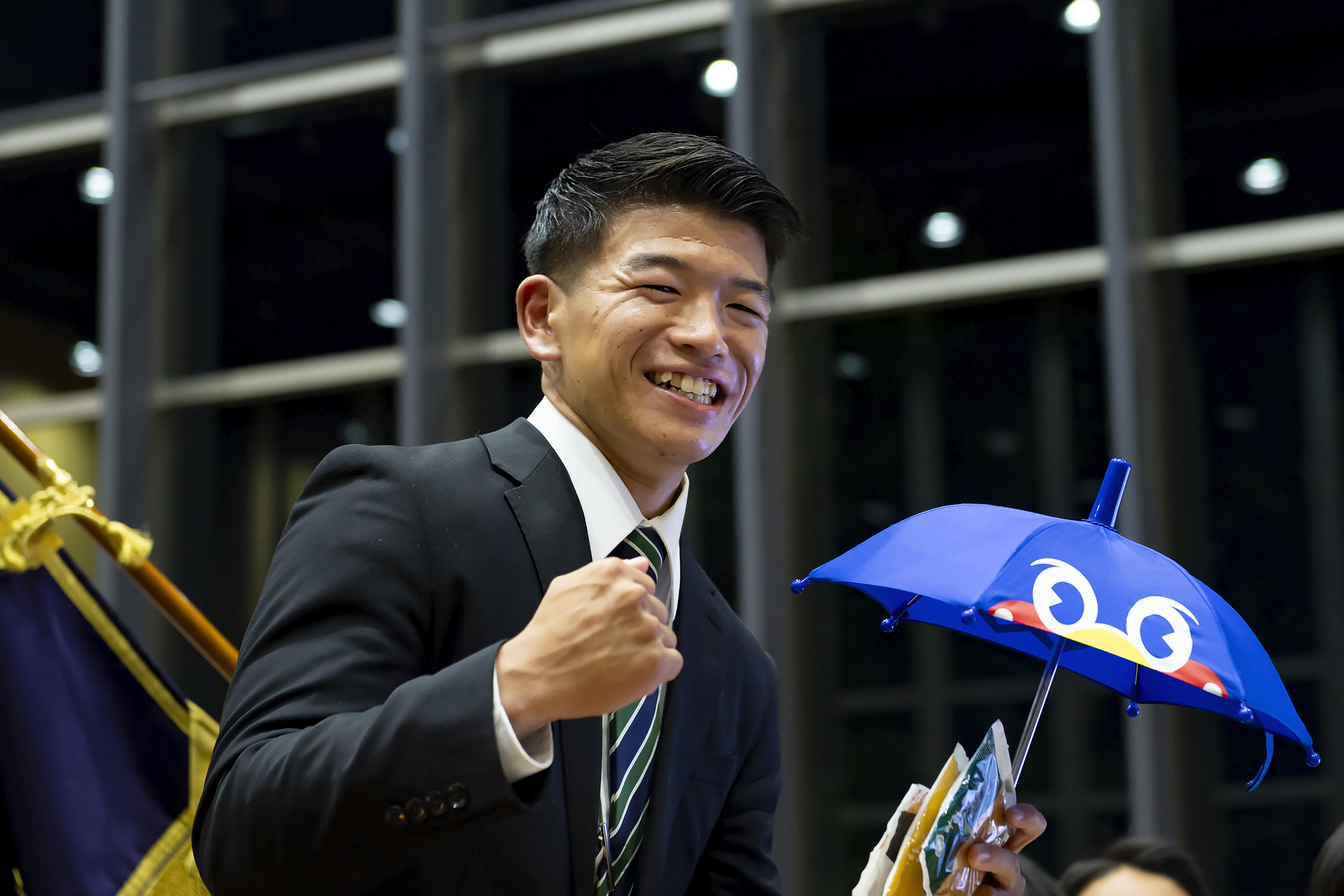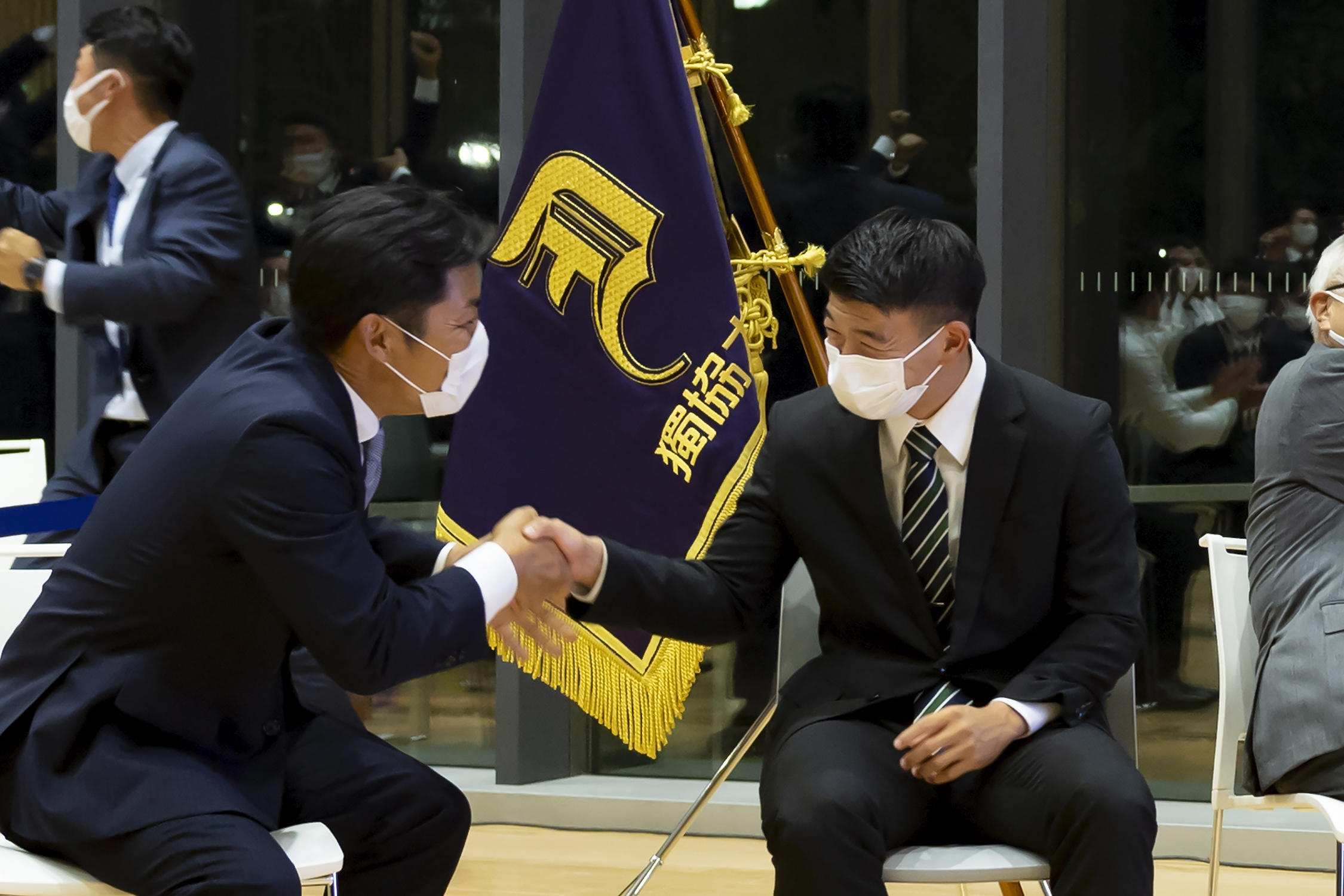 この日、硬式野球部の部員が学生センター雄飛ホールに集まり、並木選手は同期の部員、亀田晃広監督、益山光央部長(本学経済学部准教授)と指名を待ちました。指名の瞬間が訪れると、雄飛ホールは歓声に包まれ、並木選手は集まった部員らと喜びを分かち合いました。