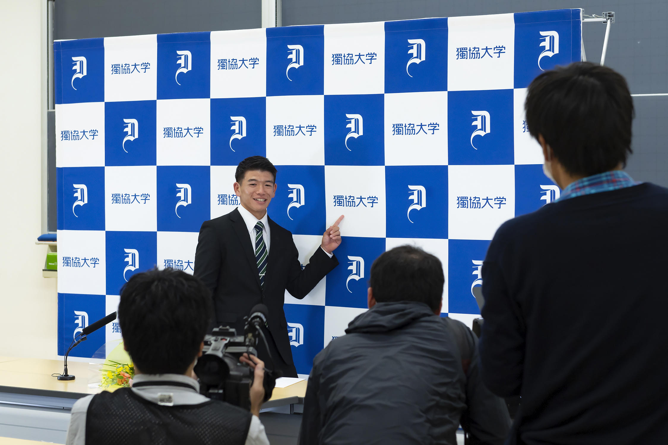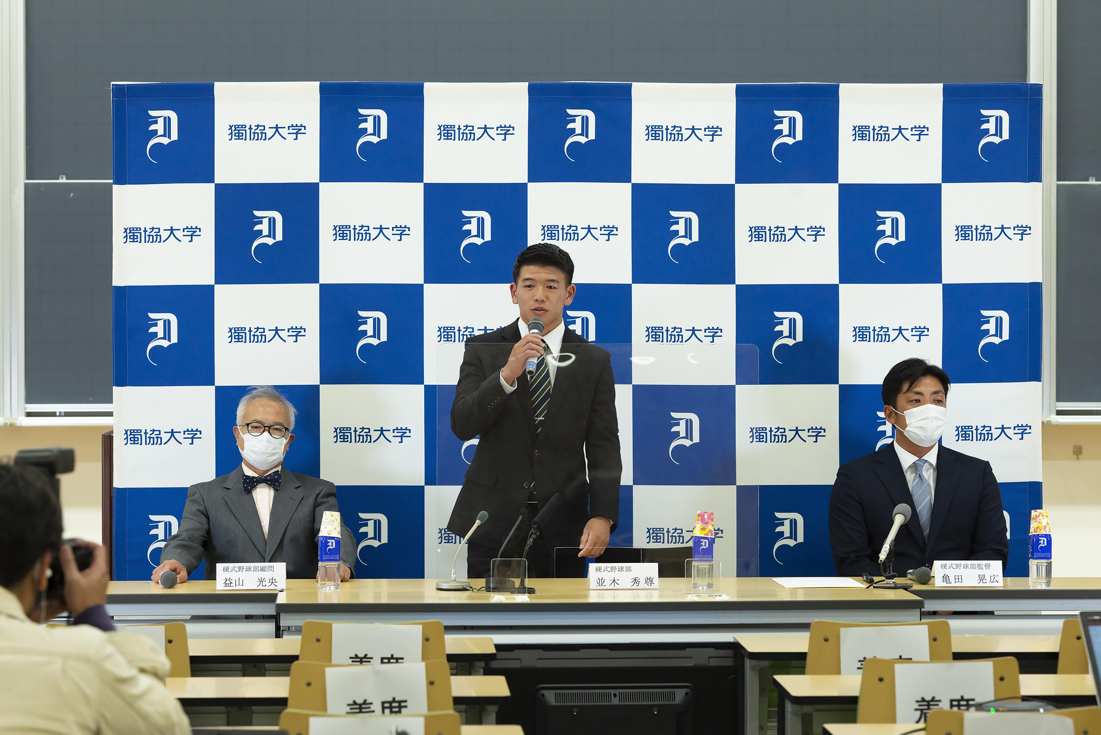 指名後に行われた記者会見で、並木選手は「指名の瞬間は、ほっとしました。今はスタートラインに立っただけなので、切磋琢磨して、周りに負けないように頑張ります」と、今後の意気込みを語りました。益山部長は「本学硬式野球部は、創立者であり初代学長の天野貞祐先生が学生野球育成に貢献があったとして、野球殿堂より特別表彰を受けています。これからも並木選手の活躍に期待しています」とコメントしました。亀田監督は並木選手について「野球だけをするために獨協大学に来たわけではなく、部活動と勉強とを両立したいという、いわば『普通の選手』」とした上で、「地元・草加で育った子が文武両道を目指し、プロに行っても活躍できることを見せてもらいたい」と語り、これからの活躍に期待を寄せました。