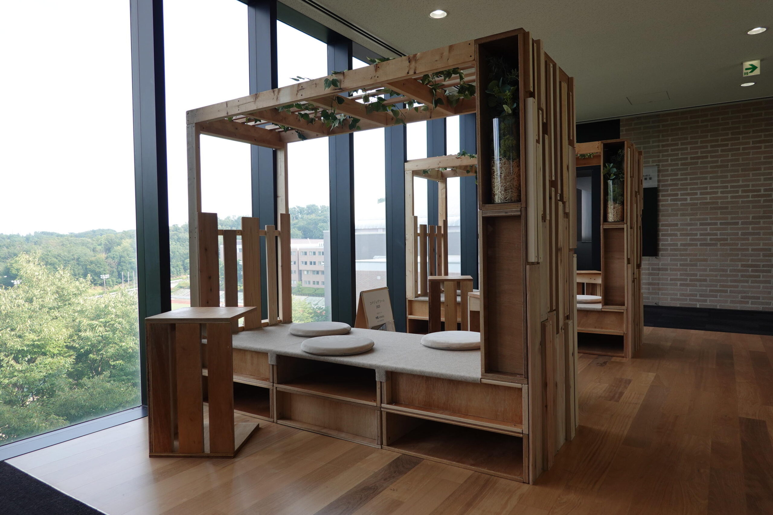 課題1では学生の居場所の使い方や過ごし方について、ヒアリングやアンケートなどによる調査をグループで実施。その結果を踏まえ、課題2として各自で居場所のデザインを提案した。その際には、廃棄予定の材料を積極的に活用し、環境への配慮を心掛けた。
