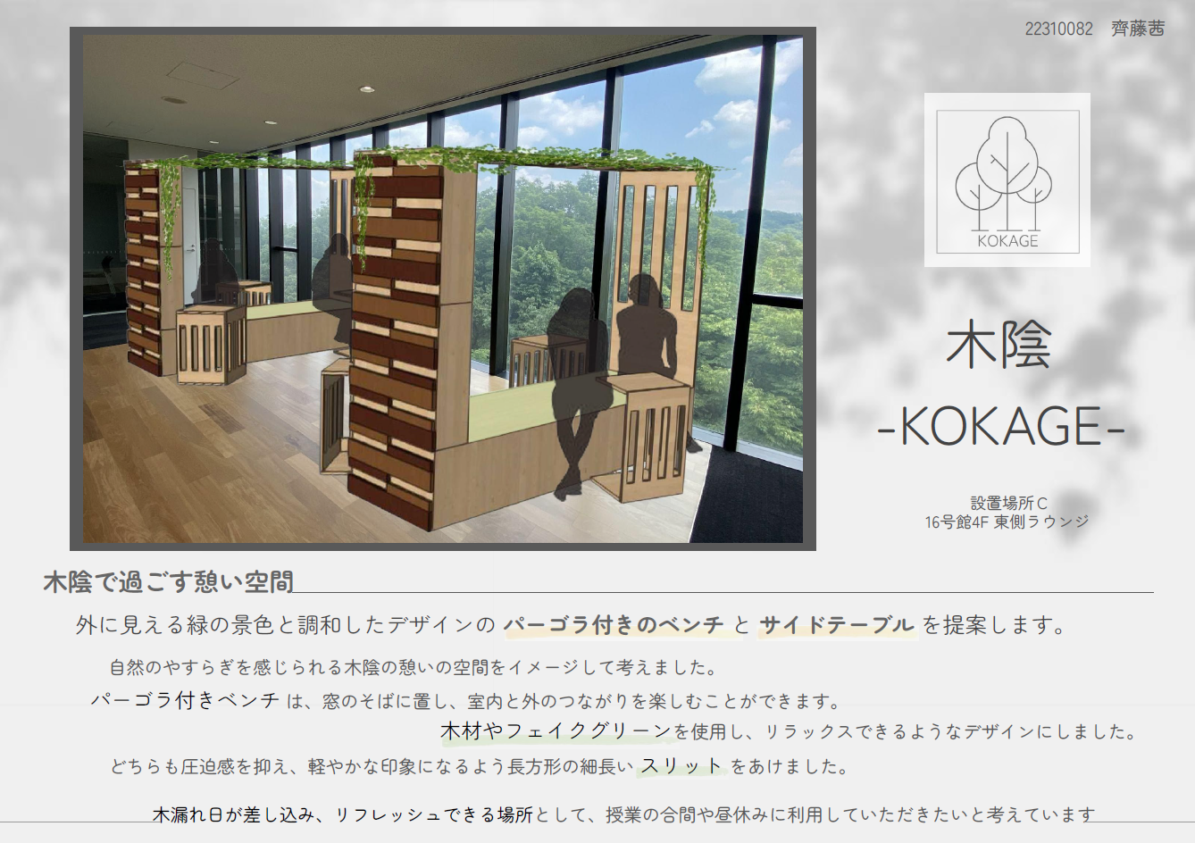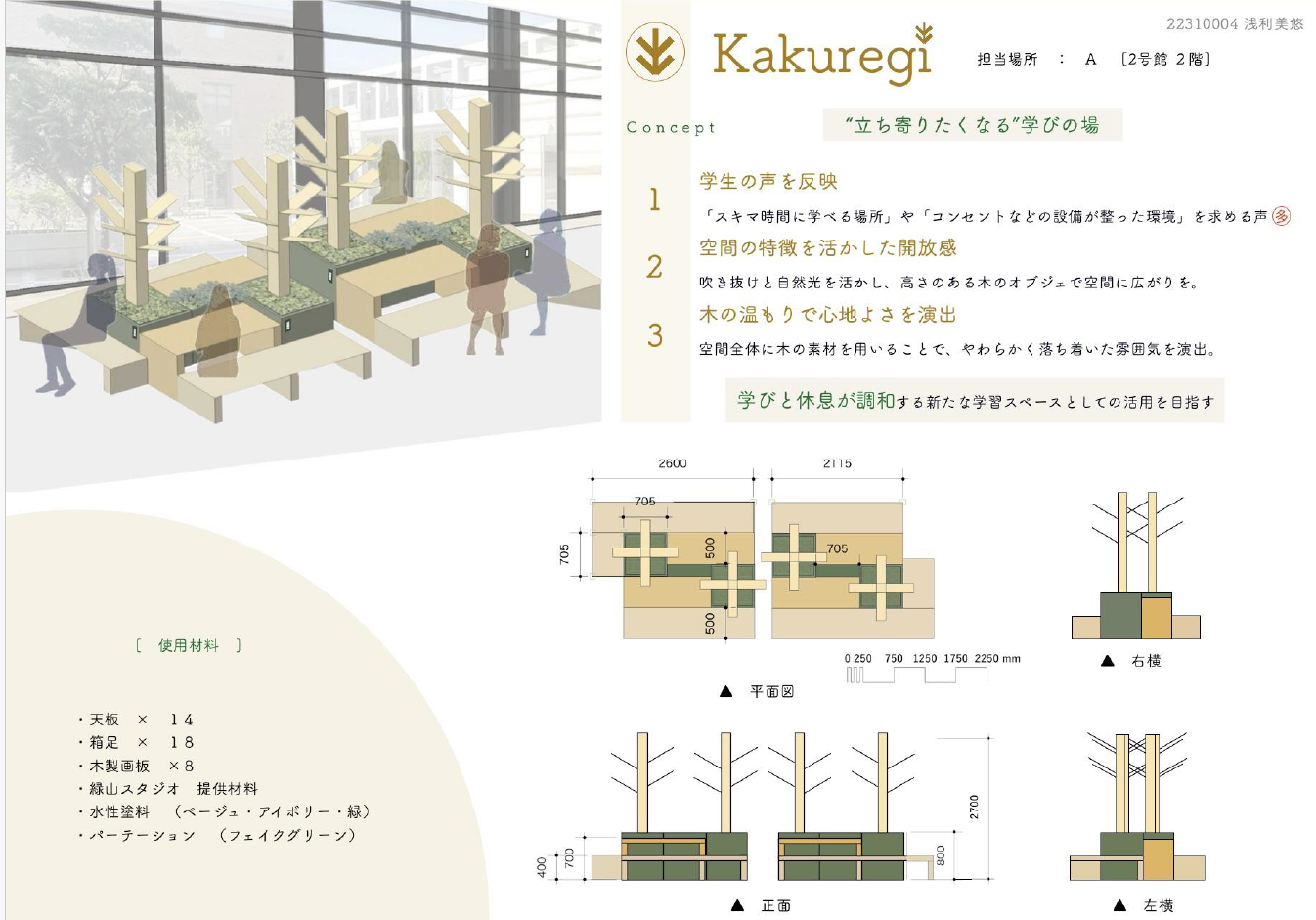 今年度は「わたしたちの居場所」をテーマとして、大学キャンパス内に学生らが授業の合間や放課後に自由に使える、居心地のよい居場所をつくる課題に取り組んだ。