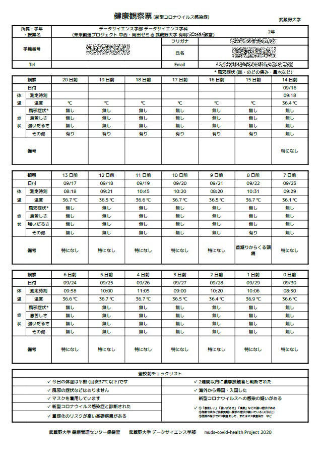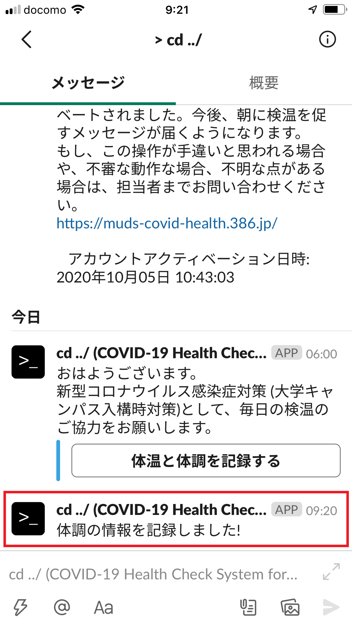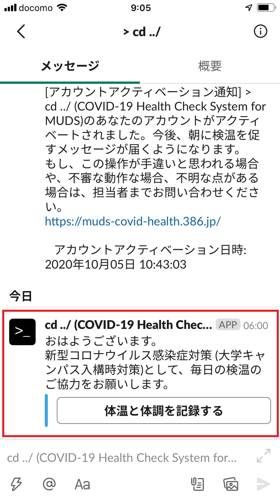 武蔵野大学(東京都江東区)データサイエンス学部データサイエンス学科生が、Slack連動型検温・体調管理(ヘルスログ)アプリ「cd ../」(COVID-19 Health Check System for MUDS)を開発しました。データサイエンス学科では入構時の検温チェックに加え、体温測定及び教員への検温結果の提出が対面授業参加の条件となっています。そのため、毎日体温を測定し、紙やスプレッドシートに記録していくことを煩わしく感じたデータサイエンス学科2年生が、検温・体調管理を手軽にできるアプリを開発しました。