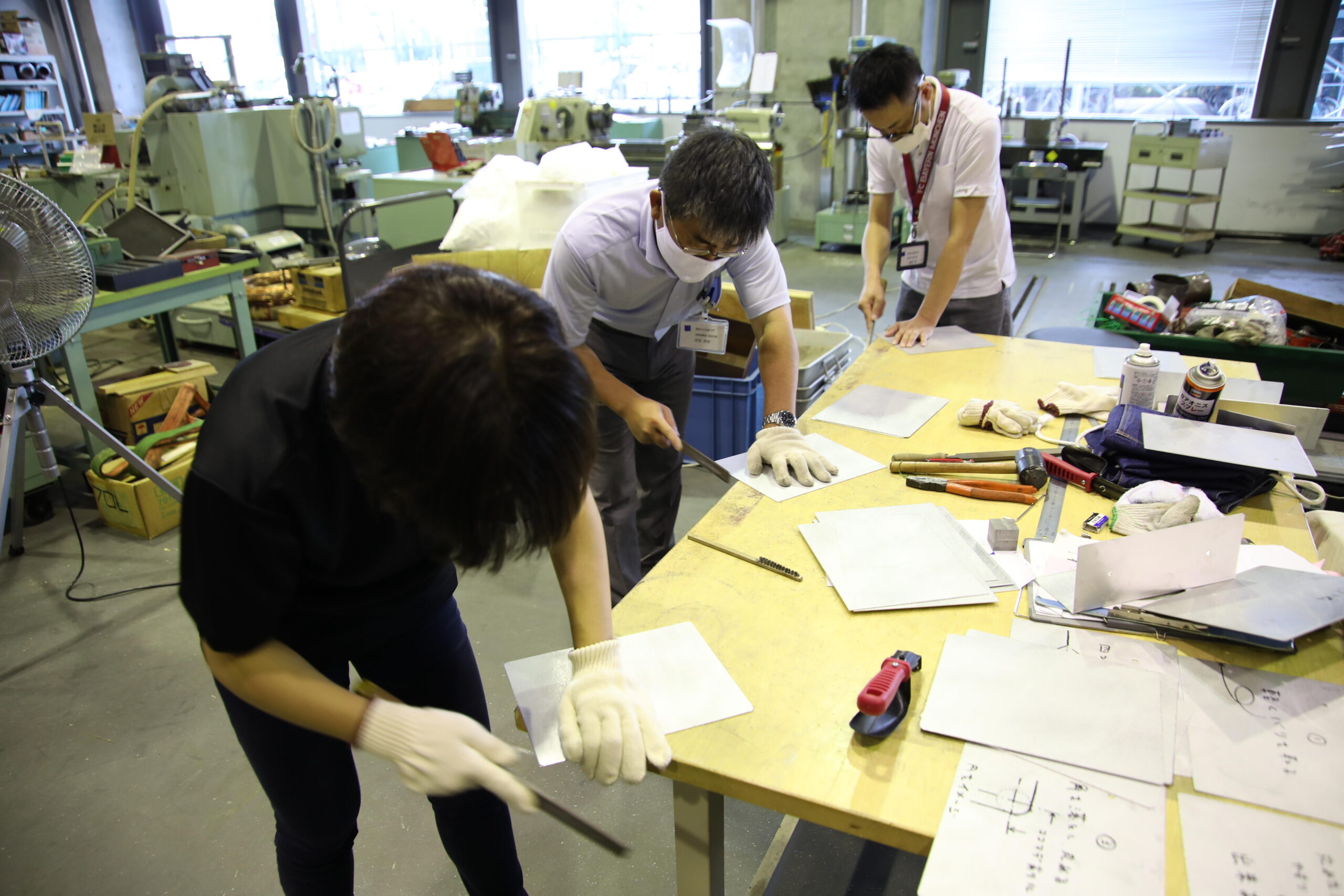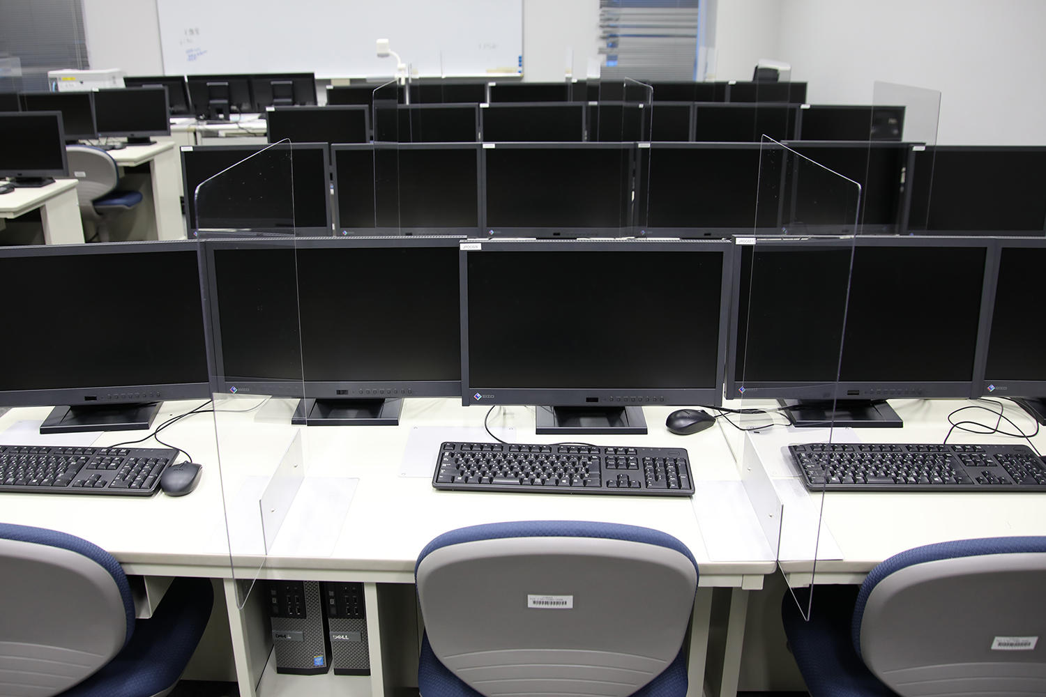共用の情報機器(PC)を使用する情報処理演習室では、ソーシャルディスタンスを十分にとることが難しいため、端末間に衝立を設置。衝立は同大の実習指導員による指導・協力のもと、学内の工房を使用して職員が加工・組立を行った。