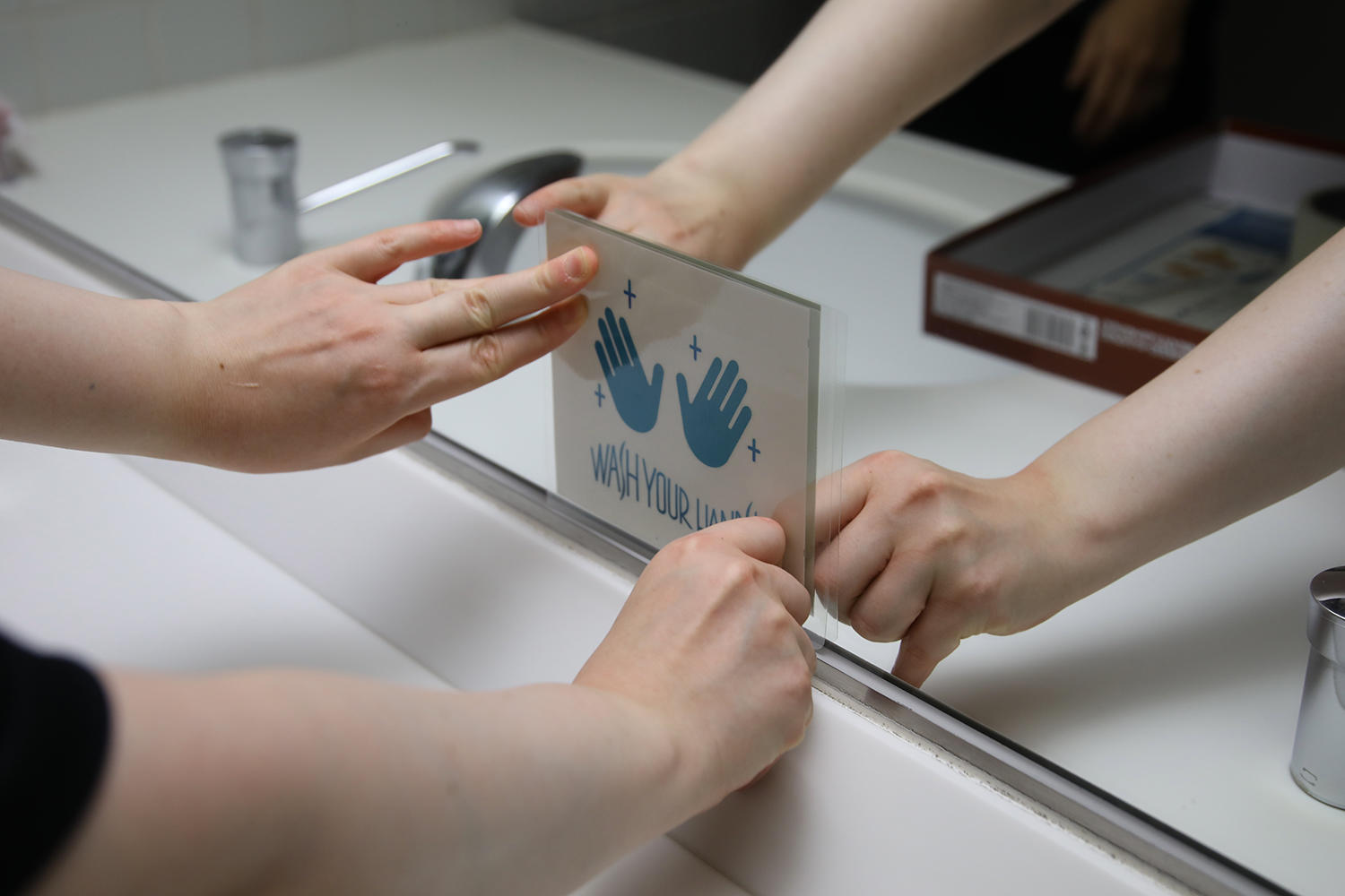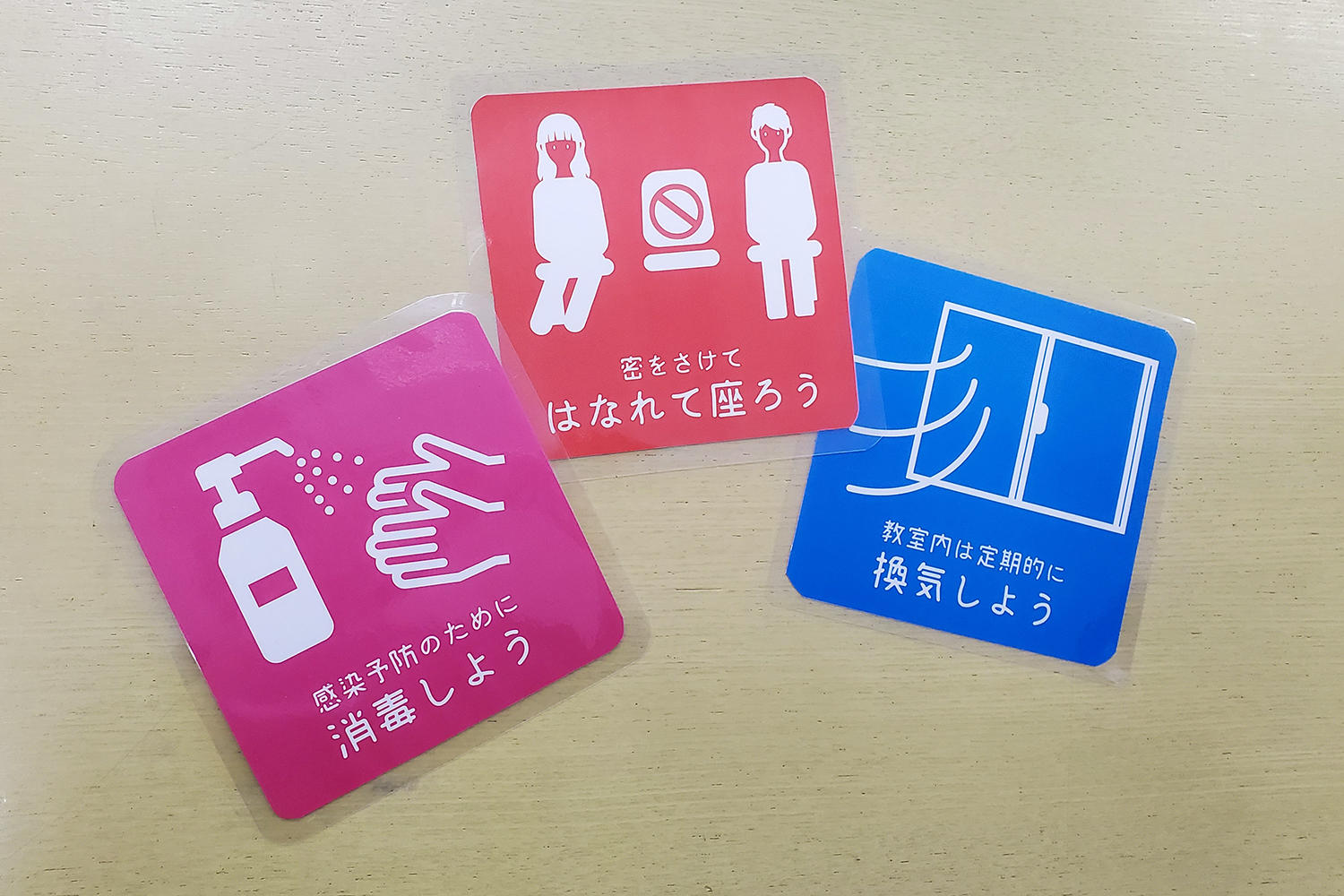 大学内の要所に「感染症対策実施中」の掲示を行い、トイレ、窓、椅子等に学生・職員がデザインした掲示物を設置している。