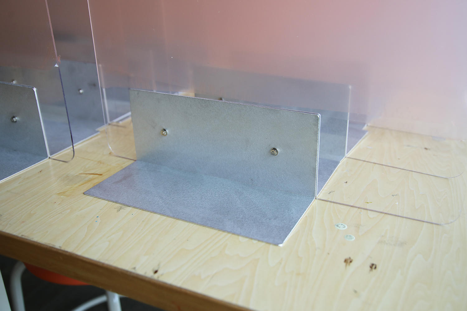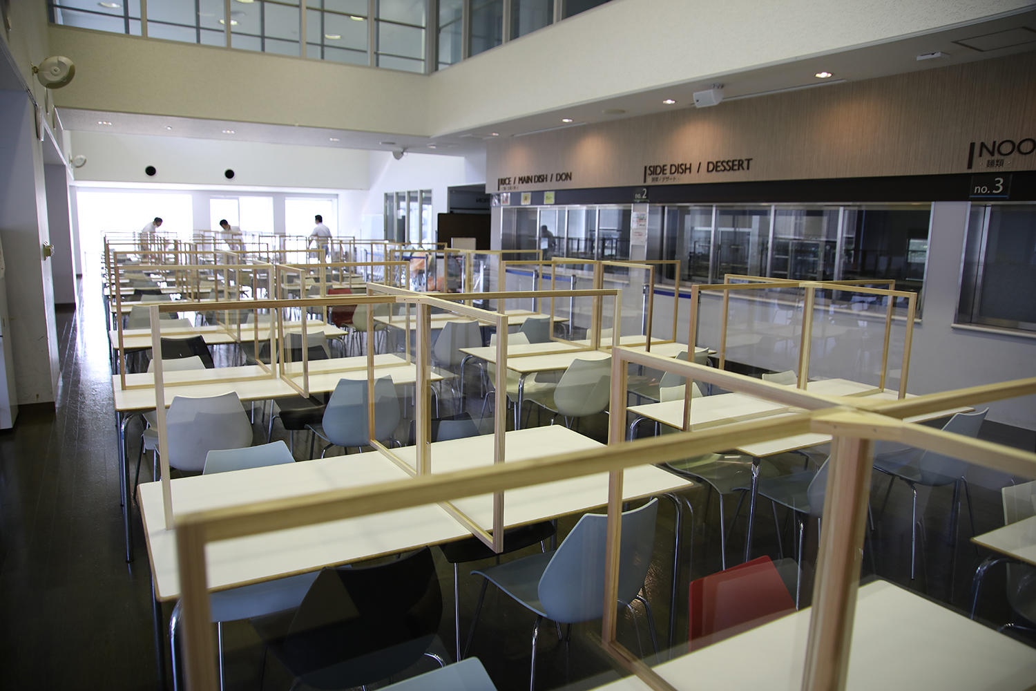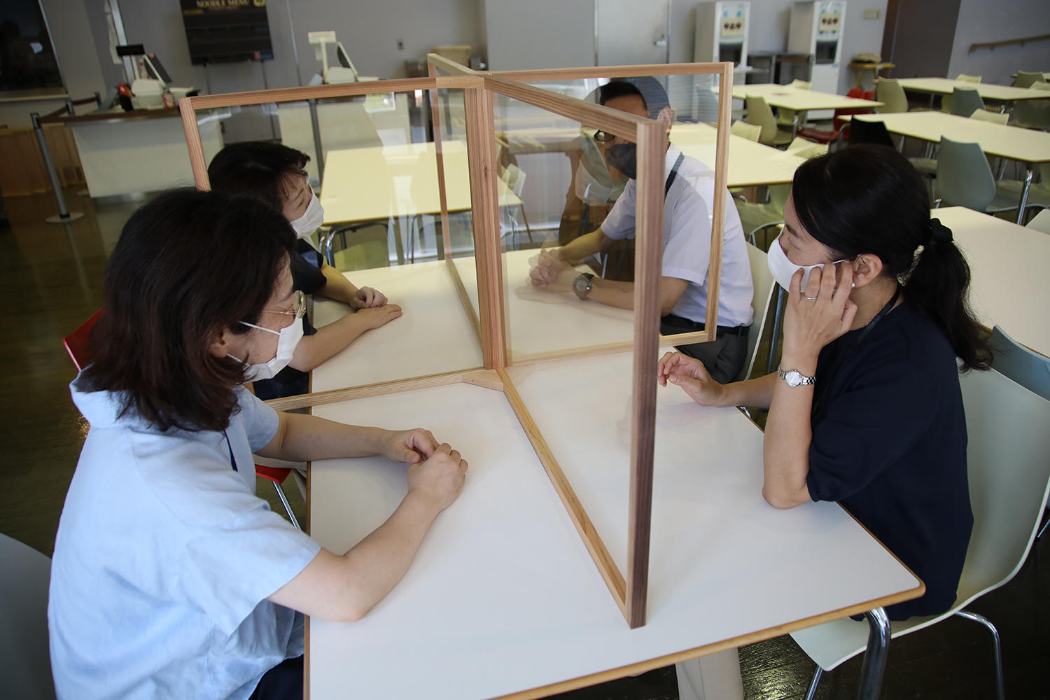 また、学生食堂には、L字型の形状2つを1組として、4人掛けの机を4分割するようにアクリル板衝立を配置した。なお、衝立の枠組みの部分には、地元・浜松市の天竜杉材を使用。制作にあたっては浜松市の「新しい生活様式支援天竜材活用事業」を活用し、対象経費(税抜き)の3分の2の補助を受けている。