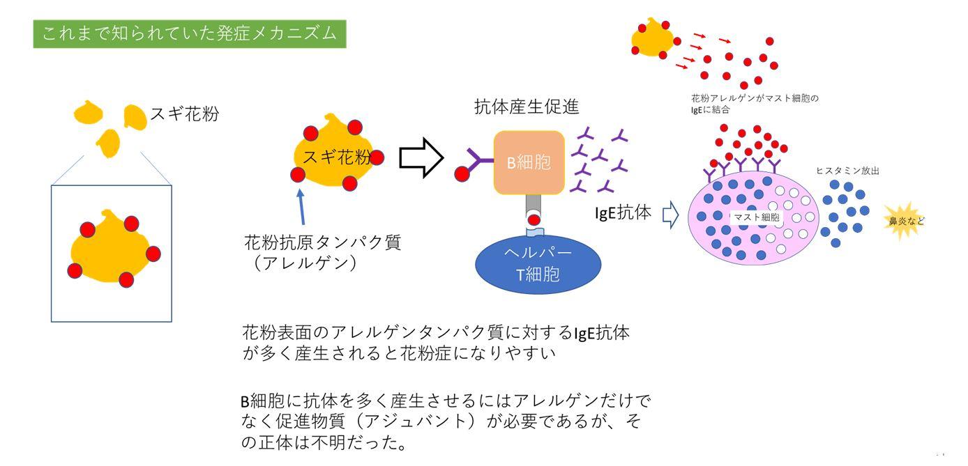 スギ花粉症では、花粉に含まれるタンパク質性アレルゲンに対するIgE抗体産生が発症の主な原因となることが知られているが、抗体産生を促進させるアレルゲン以外の免疫促進物質(アジュバント)については、あまり明確ではなかった。