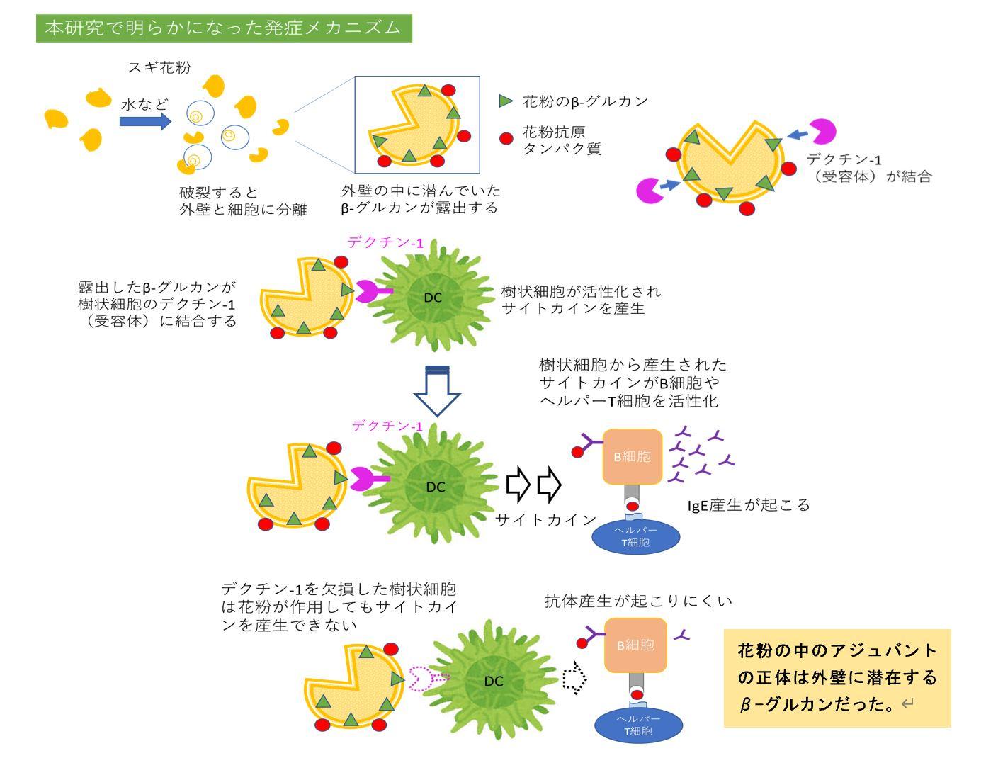 まず、培養細胞を使った実験で、スギ花粉による樹状細胞の活性化には、(1,3)- β-グルカンと結合する受容体「デクチン-1」が関わることが判明。また、マウスを使った動物実験では、普通のマウスではスギ花粉を長期間鼻に接種するとスギ花粉アレルゲン特異的なIgE抗体が産生されるのに対し、デクチン-1の遺伝子欠損マウスは、そのIgE抗体が殆ど産生されなかった。くしゃみの回数もデクチン-1欠損マウスは少なく、アレルゲンに反応してリンパ球から産生されるサイトカイン(インターロイキン-13)も普通のマウスに比べ、デクチン-1欠損マウスは著しく低下した。