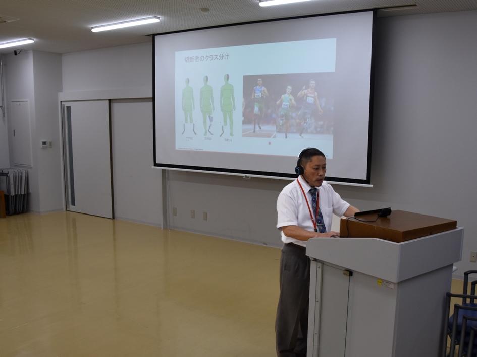 スライドに加え、映像を用いてわかりやすく障がい者スポーツや義肢装具士について説明しました。 また、事前に高校にスポーツ用義足やレース用の車いすを送り、実際に見てもらいました。