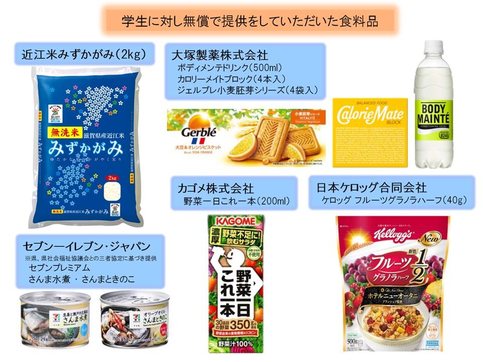滋賀県は、県内の大学等に在籍する一人暮らしの学生・留学生への支援として、近江米やシリアル、缶詰、飲料などの食料品を無償提供している。これは、新型コロナウイルス感染症の影響によるアルバイト収入の減少などによって生活に困っている学生を対象としたもの。「大塚製薬株式会社やカゴメ株式会社などの企業が食料品を無償提供し、滋賀県トラック協会が配送の協力をしている。
