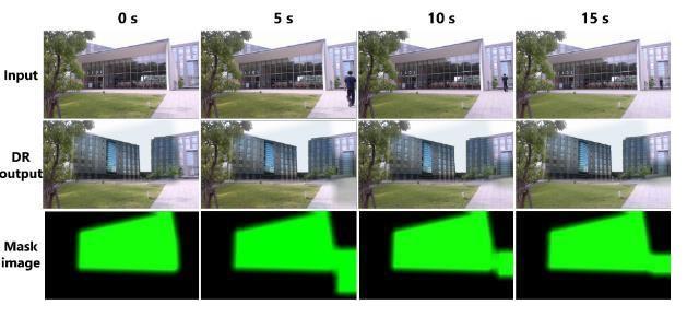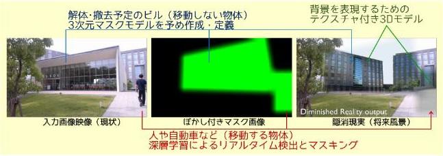 今回、福田知弘准教授らの研究グループは、深層学習(A I、機械学習の一種)によりリアルタイムに検出した物体をマスク処理※4 し、既報のDRシステムに統合することにより、構造物などの動かない物体と人や自動車などの動く物体をリアルタイムに仮想撤去できるDRを開発しました。