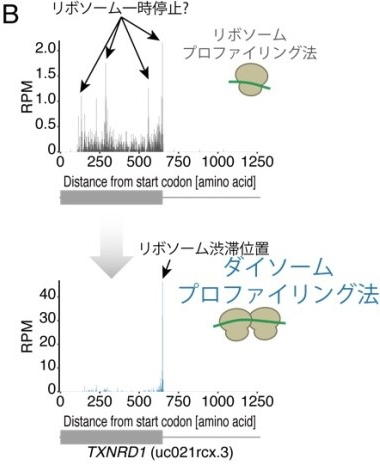 今回、京都産業大学生命科学部 三嶋雄一郎准教授と理化学研究所などの共同研究グループは、次世代シークエンサー(※2)を用い、リボソーム渋滞時に生じるmRNA断片を読み取る「ダイソームプロファイリング法」(図A)を開発。ヒト細胞と熱帯魚ゼブラフィッシュの全ゲノムで渋滞の位置を特定(図B)するとともに、リボソーム渋滞が複数の特定アミノ酸配列や終止コドンなどで起きること、渋滞したリボソームから合成される新生ペプチドの一部は不完全なものと識別されて分解されることなどを明らかにした。