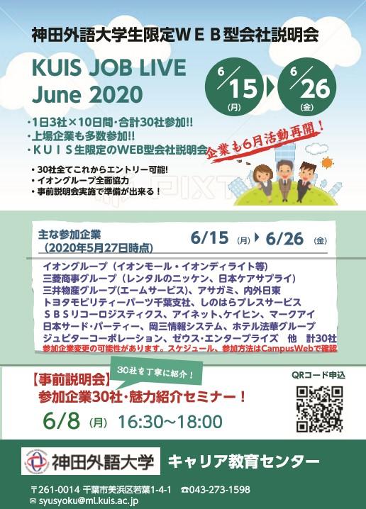 神田外語大学(千葉市美浜区/学長:宮内孝久)は、6月15日(月)~26日(金)の10日間『 KUIS JOB LIVE June2020』を開催します。これは、新型コロナウイルス感染症の感染拡大・防止を受け、参加者の健康・安全面を考慮しながら、学生たちに仕事内容や企業の魅力を広く知ってもらうことを目的として開催されるもの。オンライン会議システムを利用して、会社説明会・質疑応答が行われ、学生たちは自宅などから自由に参加することが出来ます。