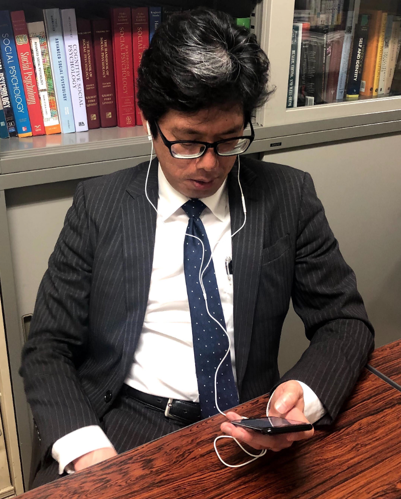 学ぶ内容や規模でZoomなどのツールを使い分けています。そのうち、4年生の卒業論文指導にスマートフォンとコミュニケーションアプリSlackの音声入力を活用しています(写真)。