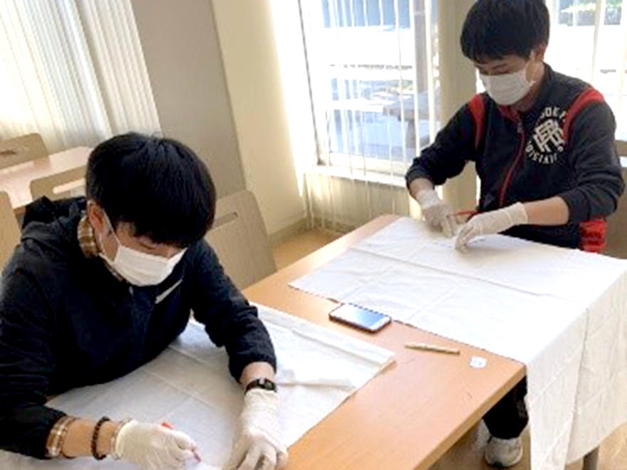 全国的なマスク不足の中、材料を集め、学内にミシンを持ちこみ、裁断、ミシン掛け、アイロン掛けなど、15名ほどで役割分担し作成しました。学内への立ち入りができなくなった後は、自宅でできる作業を続け、大人用165枚、子供用125枚を作り上げました。