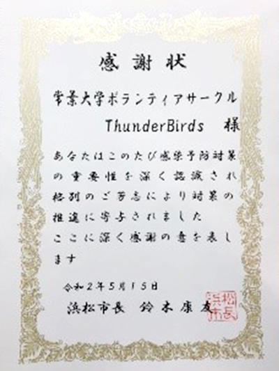 常葉大学 浜松キャンパス ボランティアサークルThunderBirdsが手作りマスクを浜松市に寄贈/社会貢献・ボランティアセンター(HUVOC)・地域貢献センター