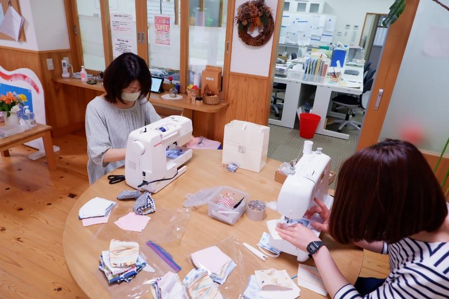 このたび、ミーティングの中で出た「子どもたちに何か元気を届けたい」との発言から、さまざまなアイディアについて検討した結果、「マスクを作って届けよう」と決定。