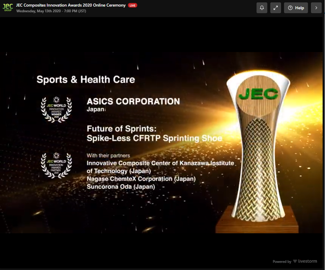当テーマには、アシックスの他、そのシューズの革新的な靴底の実現を可能にした新しい複合材料を開発したサンコロナ小田、同じくその複合材料のイノベーションに携わったナガセケムテックス、金沢工業大学ICCがパートナーとして参画しています。この4者が5月13日の表彰式において「JEC Innovation Awards 2020」スポーツ・ヘルスケア部門最優秀賞を共同で受賞しました。