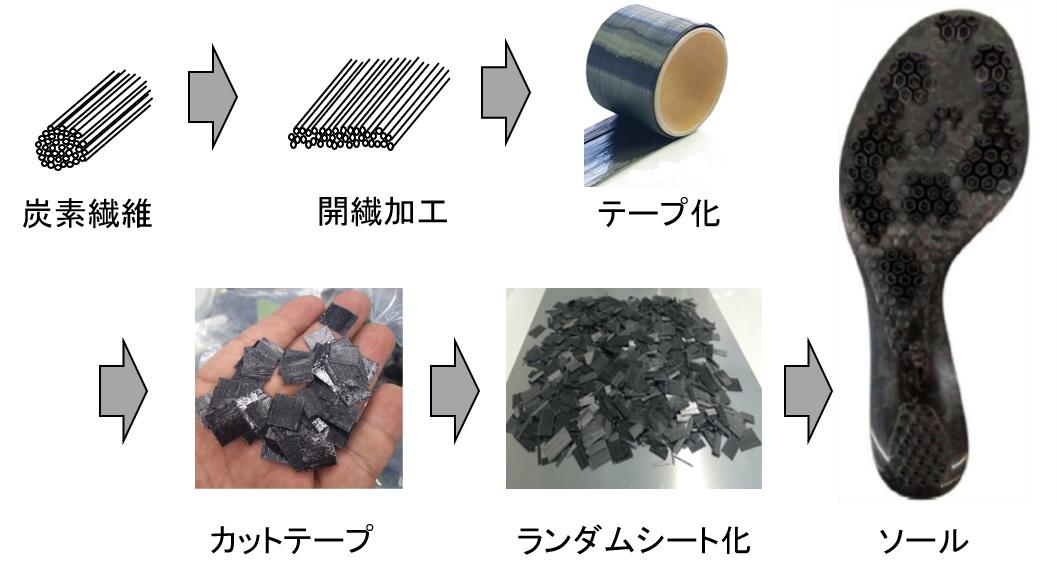 これらのイノベーションを実現した背景には、サンコロナ小田による一方向性の極薄のCFRTPテープ(※)、同テープをランダムに積層したプリフォームの開発、ナガセケムテックスによる最適なマトリックス樹脂への改善、アシックスによる同プリフォームを用いての高品質の複雑微細な形状と量産性を両立させた製造技術の開発など、サプライチェーンにおける川上から川下に位置する各社の技術革新のコンビネーションがあります。