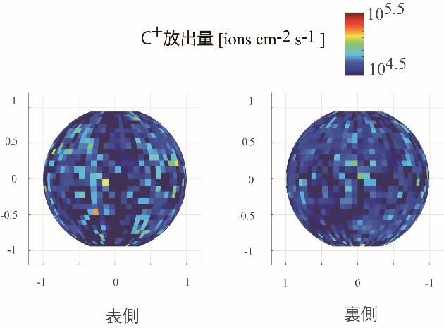 一方で、他の揮発性元素である炭素の観測は、周回衛星からの観測からは見つけることが出来ませんでした。本研究グループは、「かぐや」に搭載されたプラズマ質量分析装置の観測データから太陽光によって光電離された月の脱ガス物質を調べて、月の表面全体から恒常的に炭素イオンが流出していることを明らかにしました(図2)。