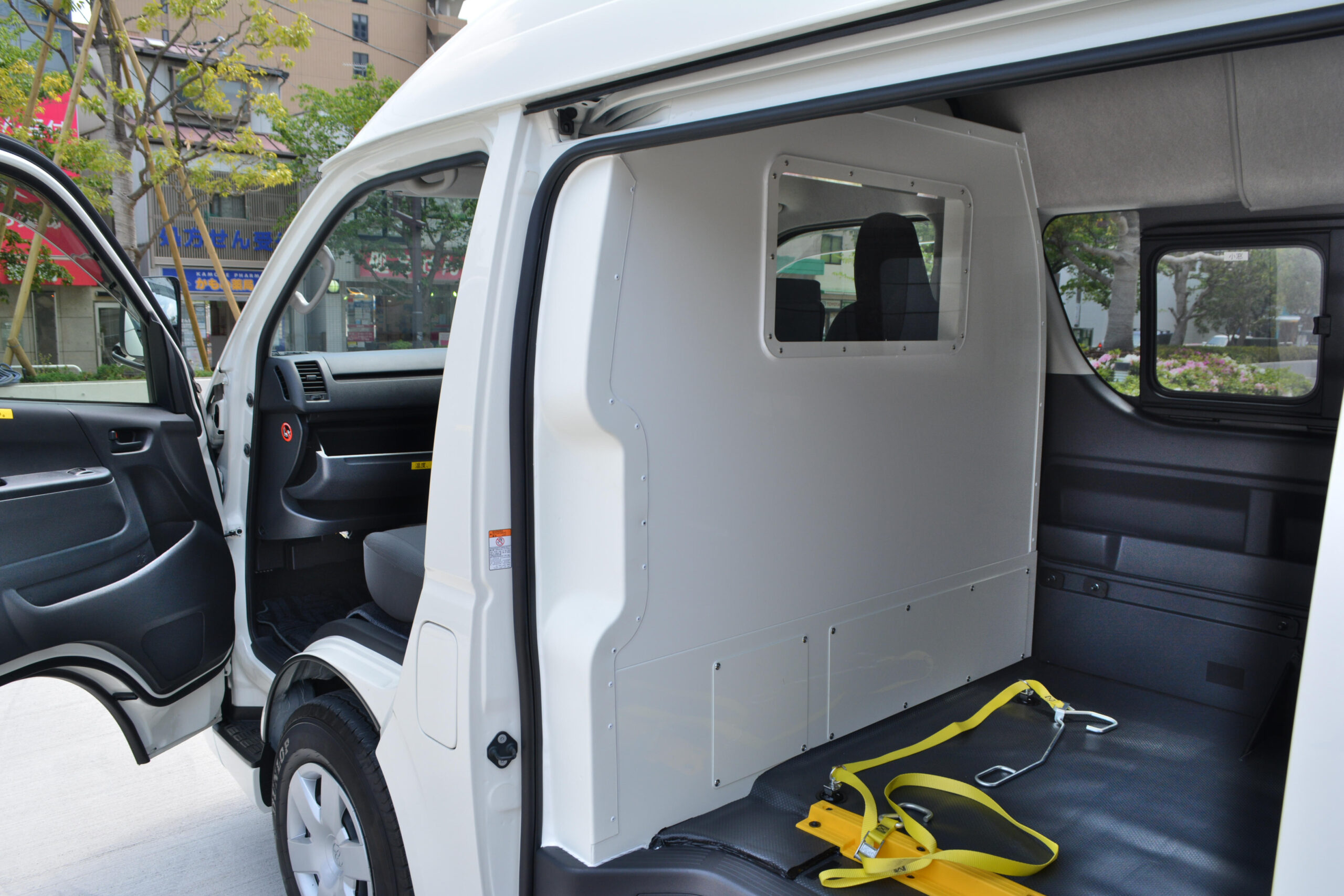 4月10日に、ジャパンタクシーをベースに改良した飛沫循環抑制車両の貸与を受けていましたが、今回は既存のハイエースを改良することで車内スペースの確保に成功し、ストレッチャーを車内に収容できるようになりました。後部座席以降の車両後方スペースの間に隔壁を設置し、排気ファンで後方の空気を常に外部に排出することで、後方の空気が前方に循環しないようにコントールできるため、運転者の安全を確保することができます。