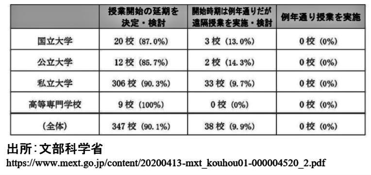 このうち大学について、文部科学省が4月10日現在で取りまとめたところによると、緊急事態宣言の対象地域(当時)の国・公・私立大学376校中、春学期を「開始時期は例年通りだが遠隔授業を実施・検討」と回答した大学は38校、率にして10.1%に留まっている。