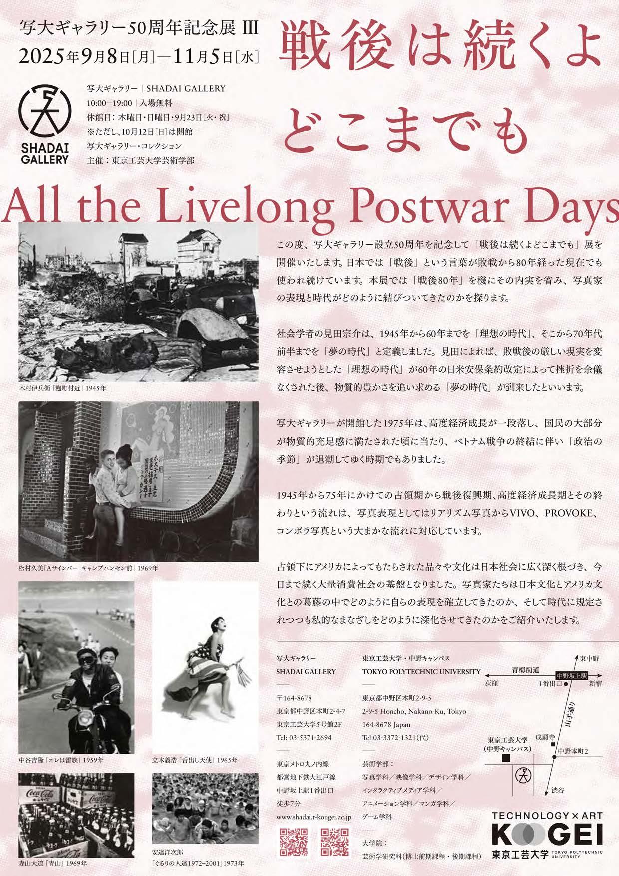 東京工芸大学(学長:吉野弘章)写大ギャラリー(所在地:東京都中野区)は、2025年9月8日(月)から11月5日(水)まで、「写大ギャラリー50周年記念展Ⅲ 『戦後は続くよどこまでも』」を開催。「戦後80年」という節目に、1945年から1975年の30年間に焦点をあて、写真家の表現と時代がどのように結びついてきたのかを探る。入場無料。
