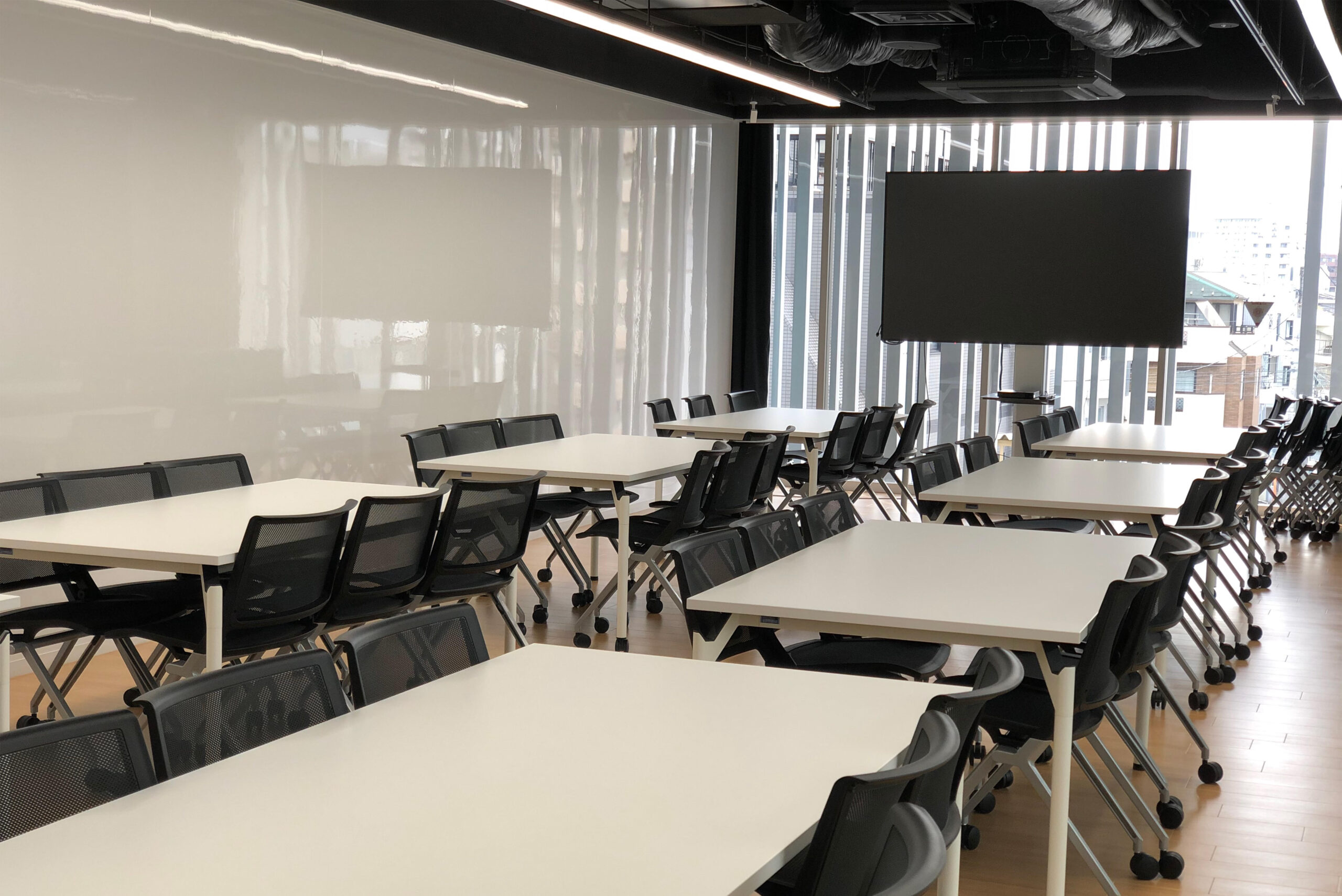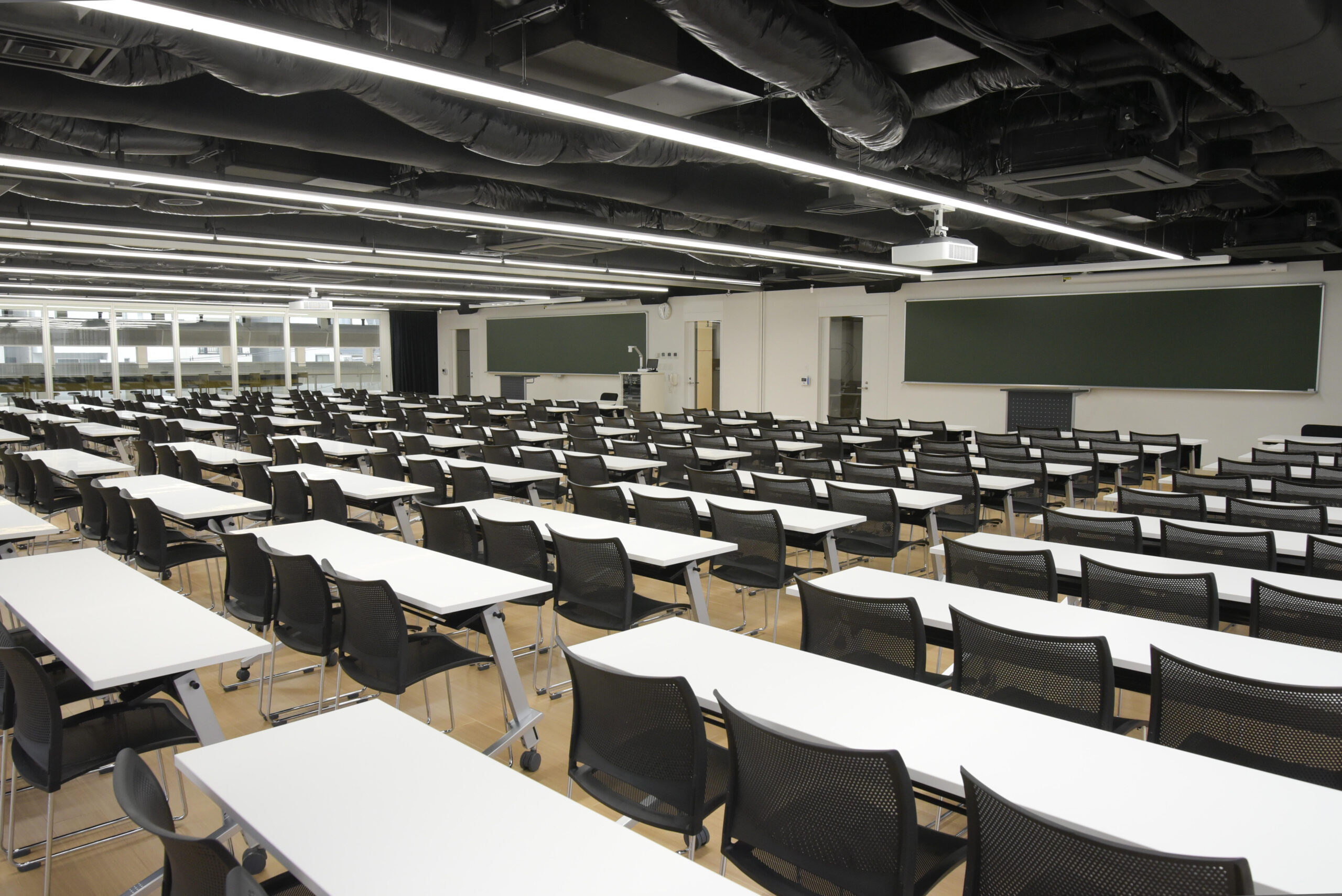 また、2階には240席の大教室が設けられ、人数によって2つの部屋に仕切ることができるフレキシブルな造りになっている。そのほか、壁一面がホワイトボードになっている3階アクティブラーニングルームには、86インチモニターと電動昇降式のディスプレイスタンドが完備され、講評や討議・グループワークに使用される。