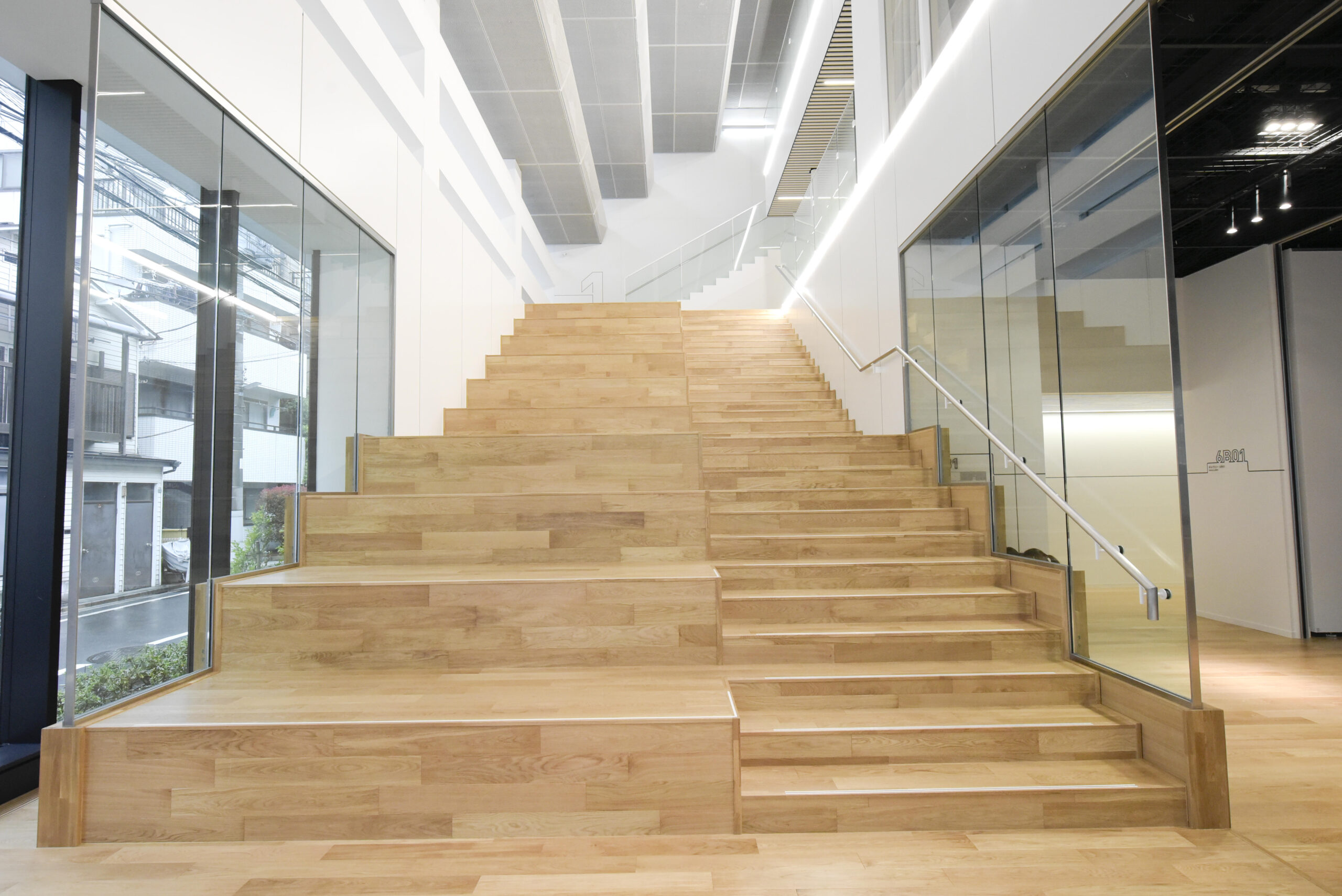 さらに、10段からなる大きなウッドベンチは、大人数が座れることができ、休憩時間の憩いのスペースとして、多目的に使える自由な広場のように使用される。