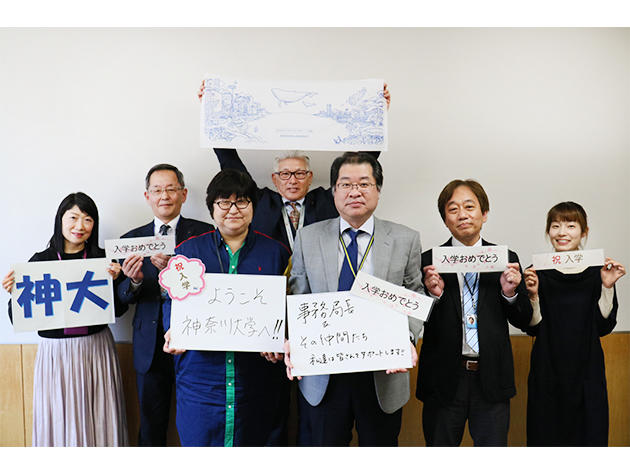 そのほか、本学公式ホームページ内「SNSで投稿しよう」(https://www.kanagawa-u.ac.jp/pressrelease/details_19989.html)では本学からもお祝いの写真を掲載しており、本学SNSにも「#春から神大」をつけ、投稿している。