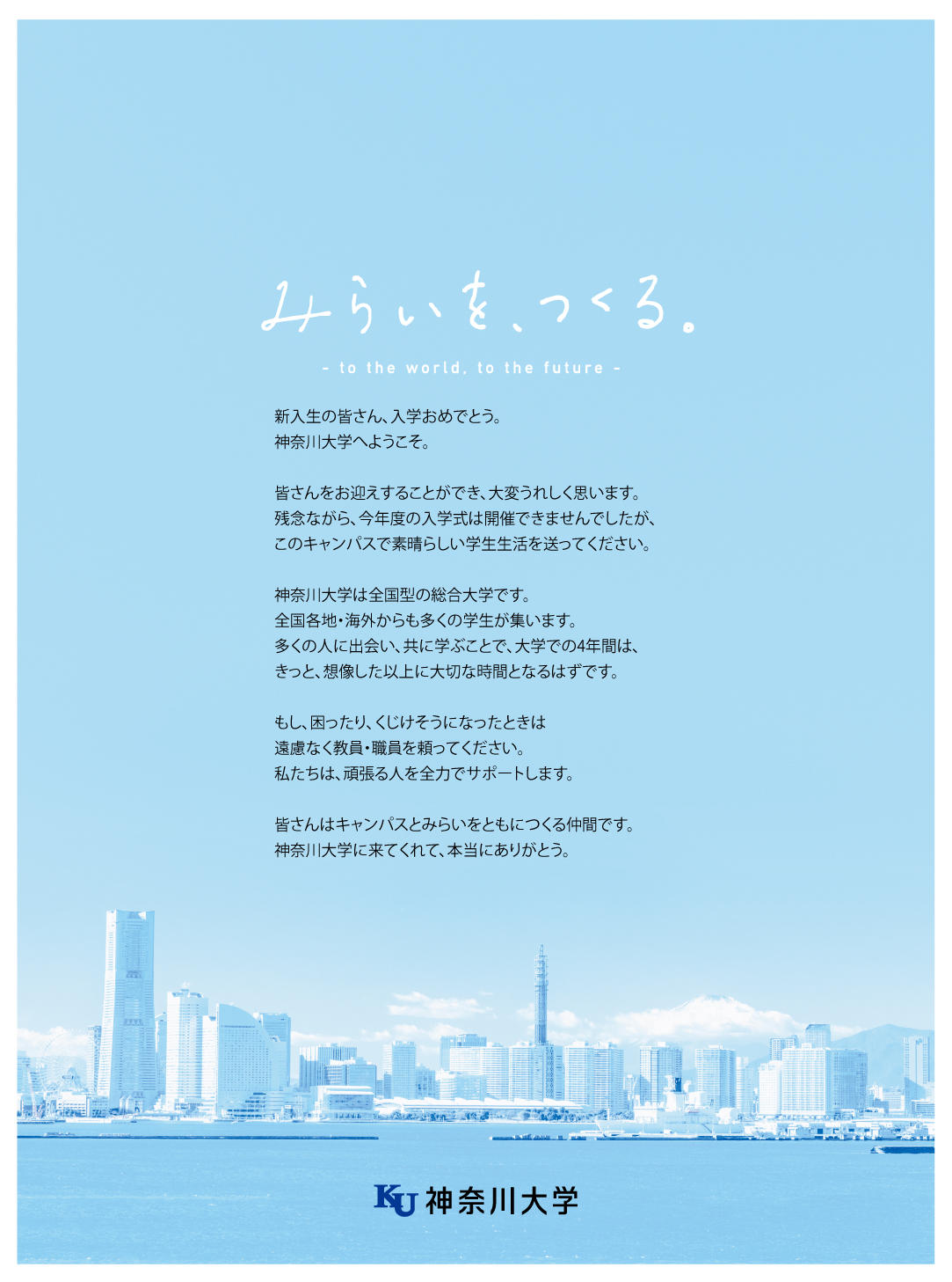 本日4月3日(金)より、入学式を開催する予定だったパシフィコ横浜があるみなとみらい線「みなとみらい駅」と「横浜駅」に新入生のみなさんへのメッセージ掲載。また、本学公式ホームページ内で兼子良夫学長からのメッセージを掲載。