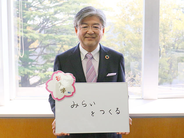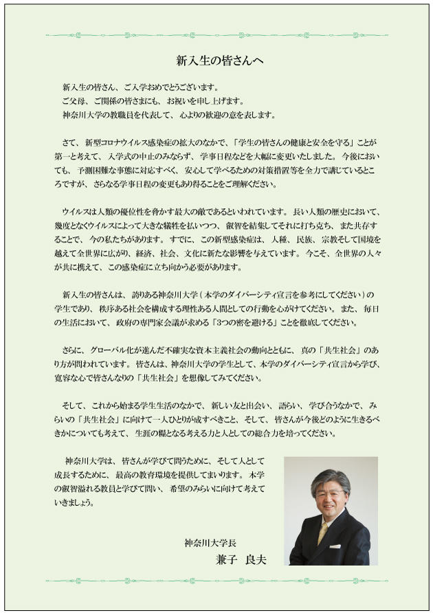 ●本学公式ホームページ内で兼子良夫学長からのメッセージのほか、新入生お祝いフォトを掲載しました。