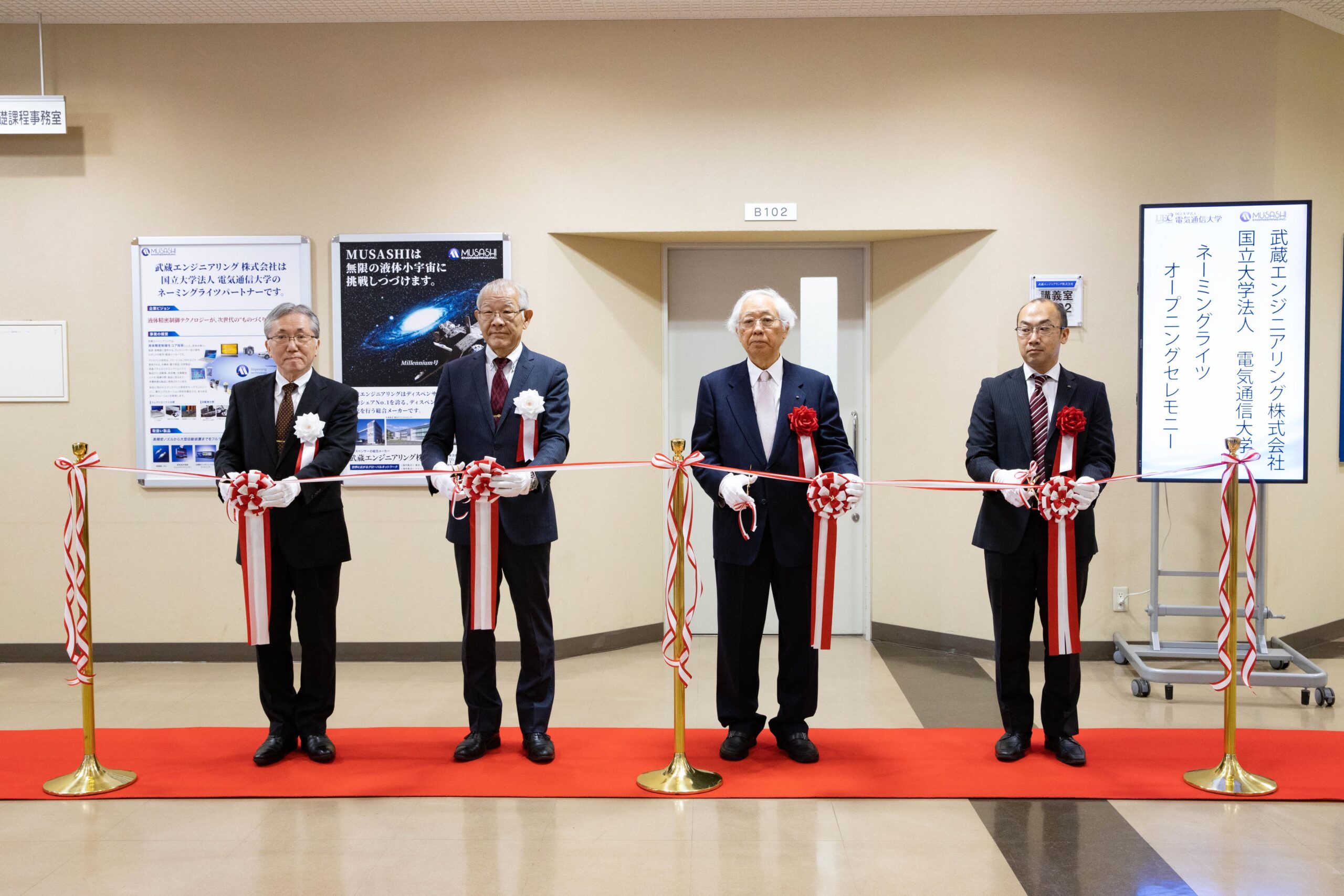 武蔵エンジニアリング株式会社(東京都三鷹市、生島和正社長 以下「武蔵エンジニアリング」)と国立大学法人電気通信大学(東京都調布市、福田喬学長 以下「電気通信大学」)は、大学施設へのネーミングライツ(施設命名権)取得に関する「国立大学法人電気通信大学ネーミングライツに関する協定書」を令和2年3月5日に締結し、3月19日にオープニングセレモニーを実施した。