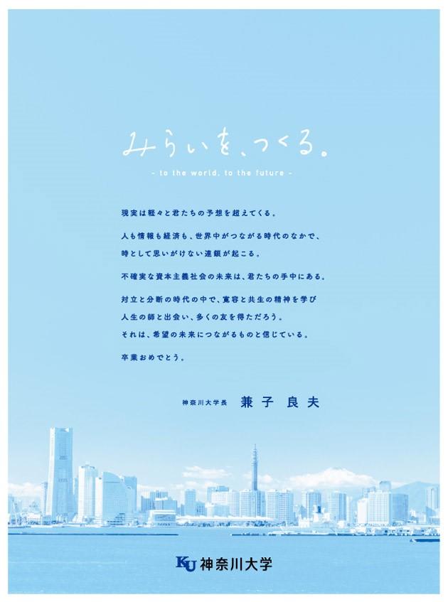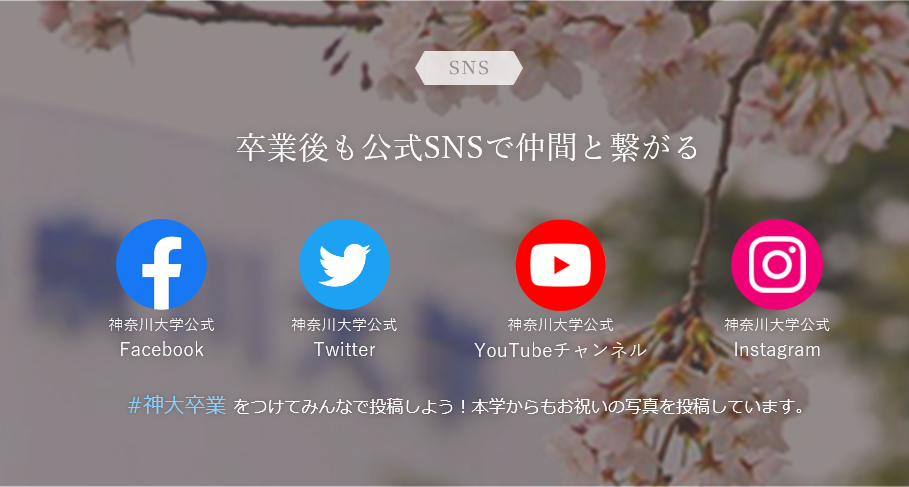 そのほか、本学公式ホームページ内「卒業おめでとう特設ページ」(https://www.kanagawa-u.ac.jp/graduation2019/)では兼子良夫学長式辞のほか、先輩である横浜DeNAベイスターズ 濱口遥大投手(2016年人間科学部卒業)からの応援メッセージやSNS企画も掲載。